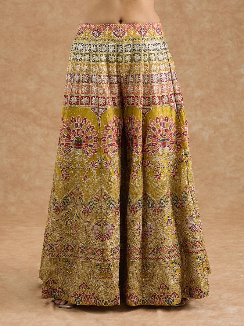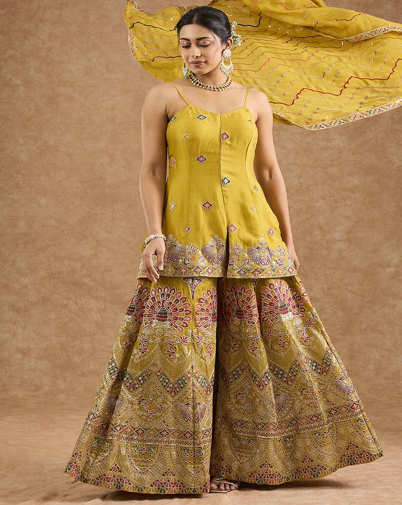 | Product Name | Mustard Chinon Multocolored Thread Work Peplum Sharara Set | |