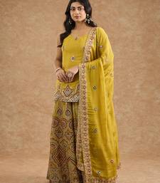 Mustard chinon multocolored thread work sharara set stitched