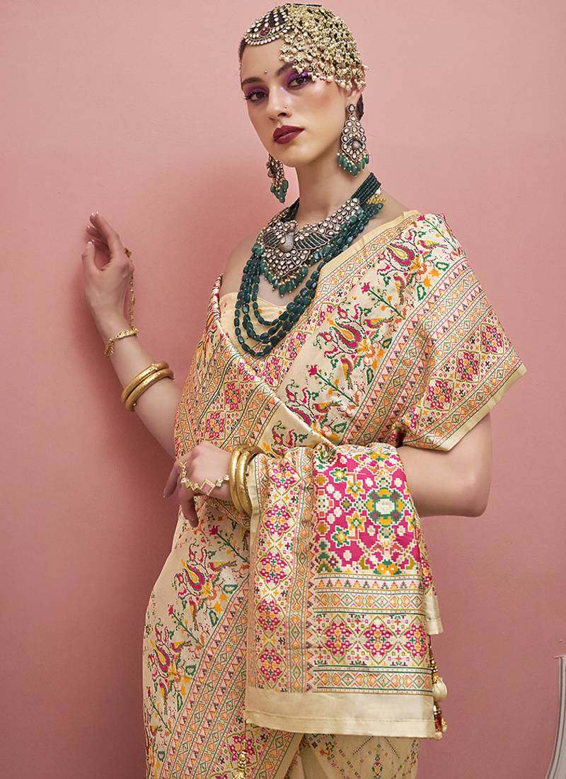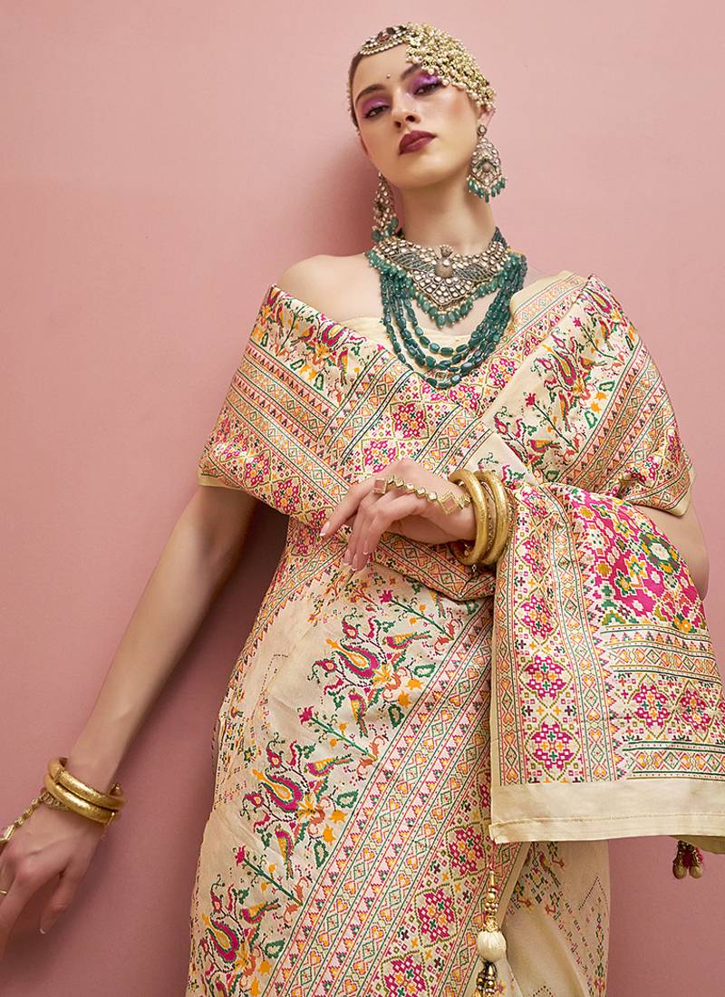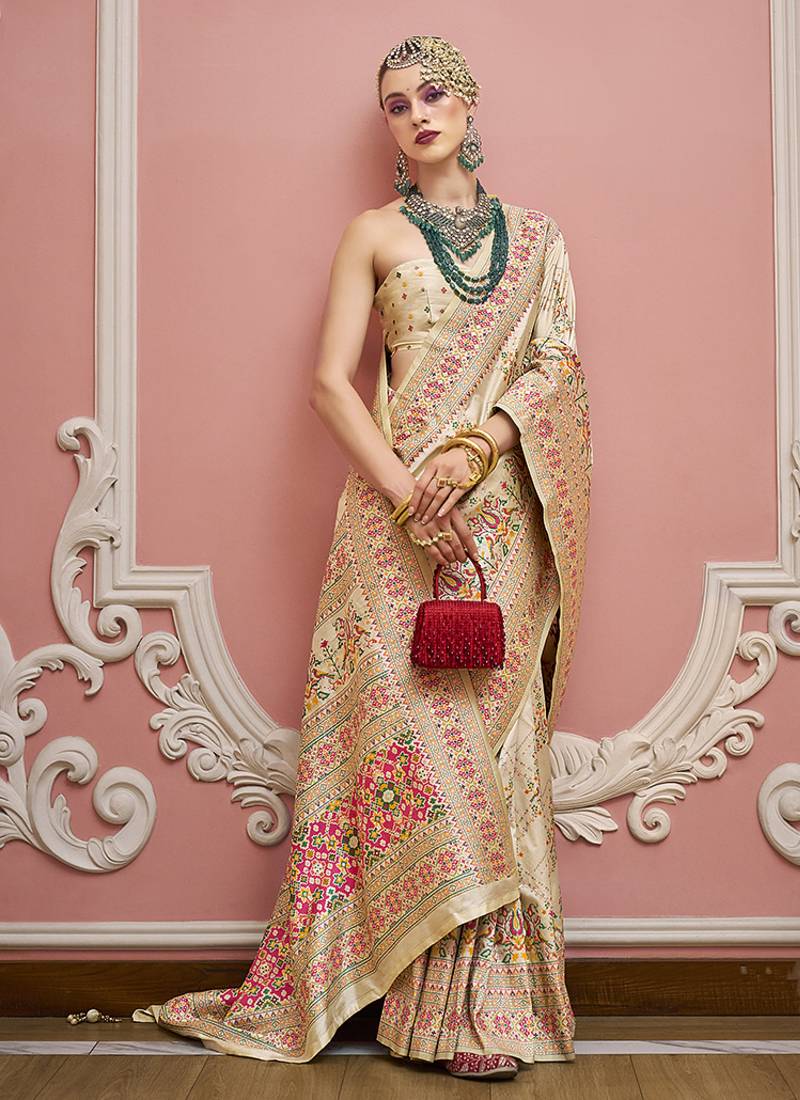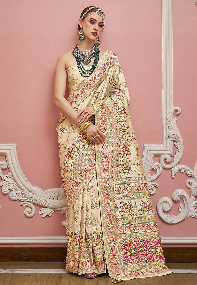 Cream faux banarasi art silk traditional saree with meenakari and weaving work