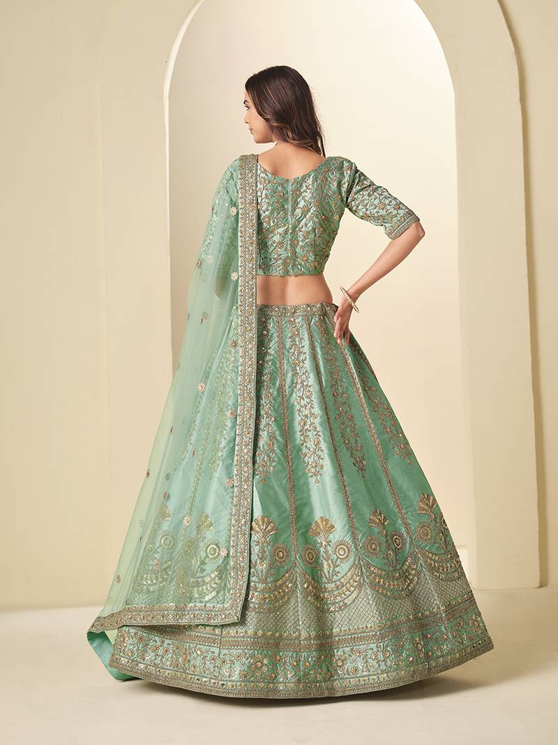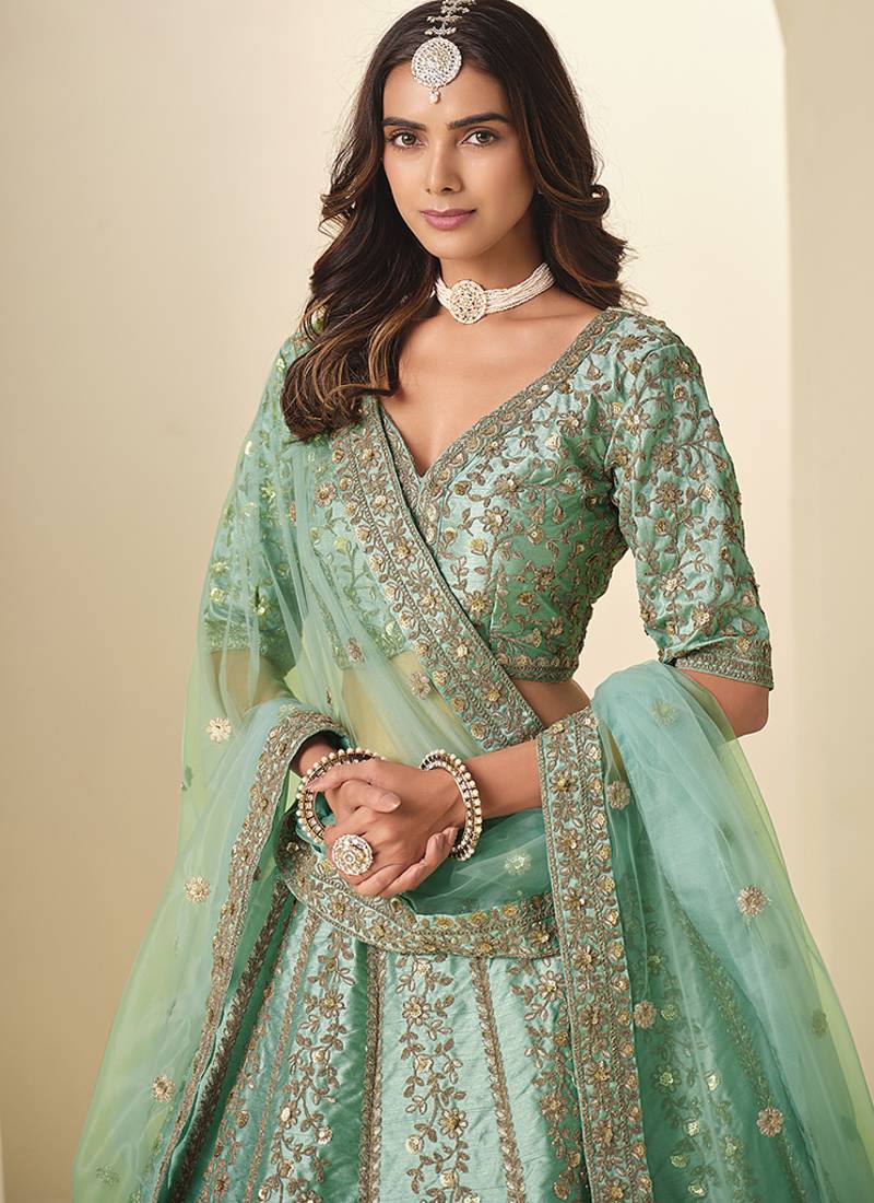 | Product Description | This Sea Green Art Silk Lehenga Choli Combines Intricate Embroidery, Resham Detailing, And Subtle Sequins That Create A Luxurious And Textured Appearance. The A Line Skirt Flows Gracefully, Forming A Flattering Silhouette While The V Neck, Half Sleeved Blouse Mirrors The Same Elegant Embellishments For A Coordinated Look. Complemented By A Matching Net Dupatta Adorned With Delicate Embroidery Along The Edges, This Semi Stitched Ensemble Is Perfect For Weddings, Festive Celebrations, And Ethnic Occasions Where Soft Tones, Refined Craftsmanship, And Graceful Movement Define The Outfit. |