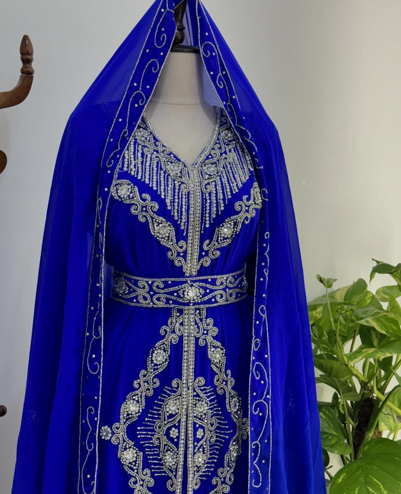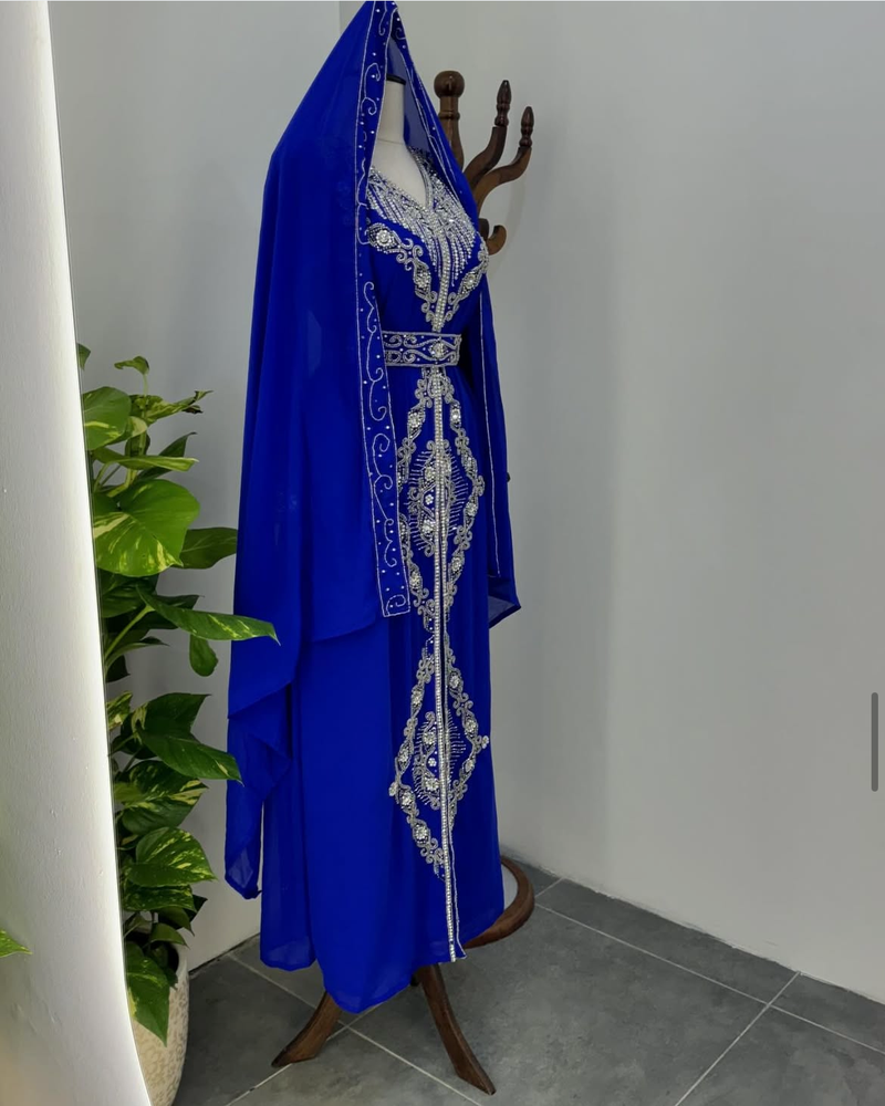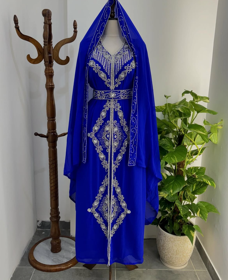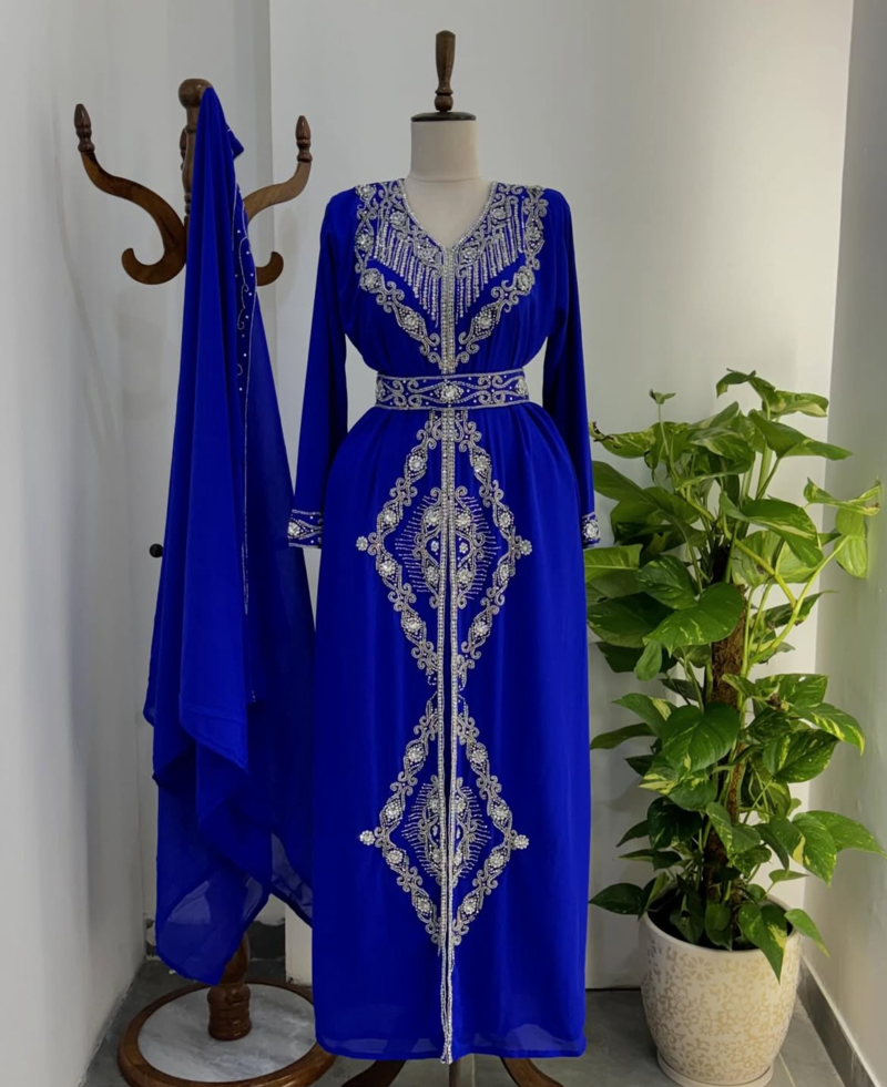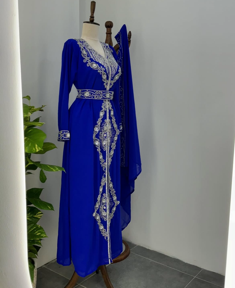 | Product Description | Step Into Elegance With This Stunning Royal Blue Moroccan Kaftan, Designed To Give You A Royal And Graceful Look. The Kaftan Is Made From Premium Quality Georgette Fabric That Feels Soft, Smooth, And Comfortable To Wear For Long Hours. It Features Rich Silver Embroidery On The Front, Neck, And Sleeves, Giving It A Luxurious And Eye Catching Appearance. The V Neck Design With Intricate Handwork Adds Charm And Makes It Perfect For Any Special Occasion. The Matching Embroidered Belt Helps To Highlight Your Waist And Gives A Perfectly Balanced And Elegant Fit. It Also Comes With A Matching Dupatta That Completes The Traditional Yet Stylish Look. This Kaftan Is A Wonderful Choice For Weddings, Festive Events, Family Gatherings, Or Eid Celebrations. The Color Royal Blue With Shiny Silver Embroidery Gives A Classy And Timeless Touch, Making It Suitable For Both Day And Night Functions. If You Love Wearing Outfits That Are Stylish, Modest, And Comfortable, This Kaftan Is The Best Choice For You. Pair It With Your Favorite Heels And Accessories To Complete Your Beautiful Traditional Look And Make Every Moment Memorable. |