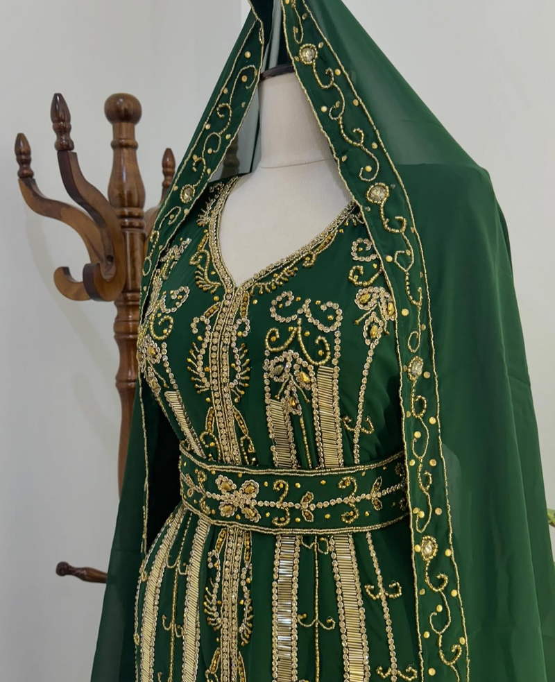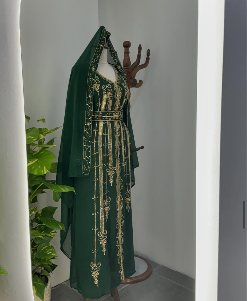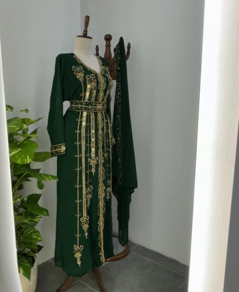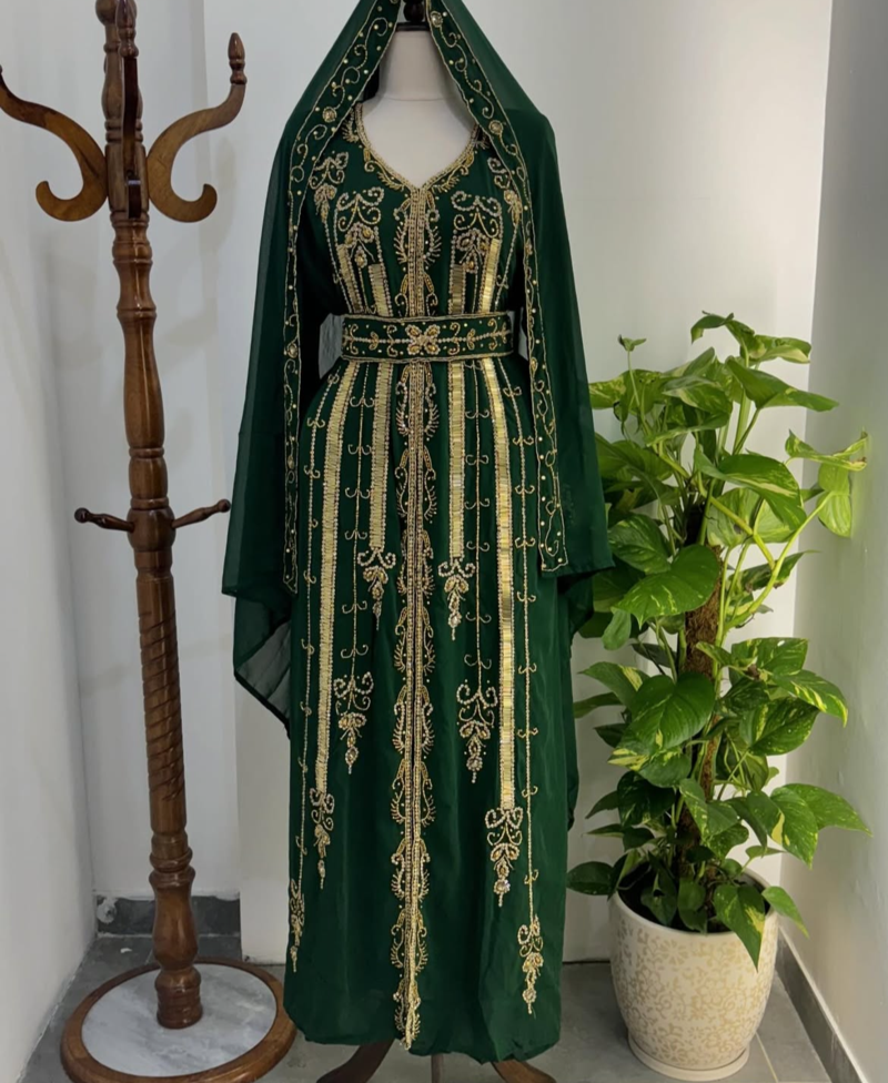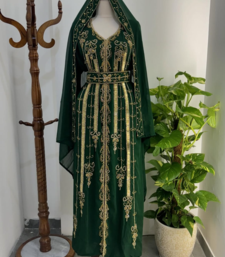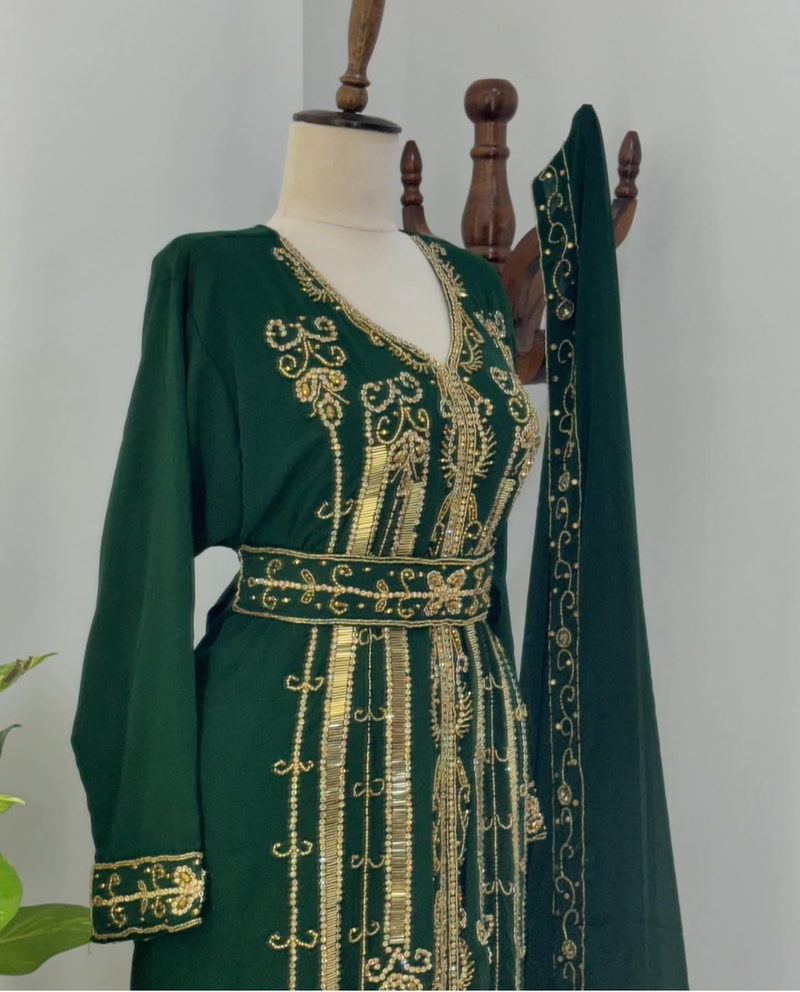 | Product Description | Bring Out Your Royal Charm With This Luxurious Green Embroidered Kaftan, A Perfect Blend Of Elegance And Tradition. Crafted From Premium Soft Georgette, This Stunning Outfit Features Intricate Golden Embroidery All Over The Front, Adding A Rich And Regal Appeal. The Matching Belt Highlights The Waist Beautifully, Offering A Flattering And Graceful Silhouette. This Kaftan Is Designed To Give You A Modest Yet Fashionable Look, Perfect For Weddings, Eid Celebrations, Or Special Gatherings. The Emerald Green Color Combined With Fine Gold Thread Detailing Adds A Royal And Timeless Touch That Makes You Stand Out Effortlessly. Pair It With Gold Jewelry And Heels For A Complete Festive Look That Exudes Sophistication And Style. |