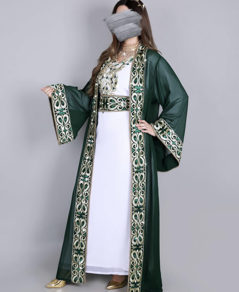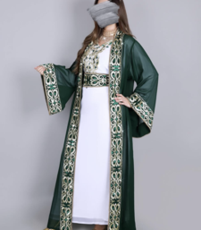 The Kaftan Is Made From Soft Premium Georgette Fabric That Drapes Beautifully And Feels Smooth On The Skin. The White Inner Dress Gives A Fresh, Elegant Base, While The Green Outer Robe With Detailed Embroidery Adds Richness And Depth To The Overall Look. Every Part Of The Embroidery Is Handcrafted With Golden Zari And Thread Work, Giving It A Royal And Luxurious Appearance.