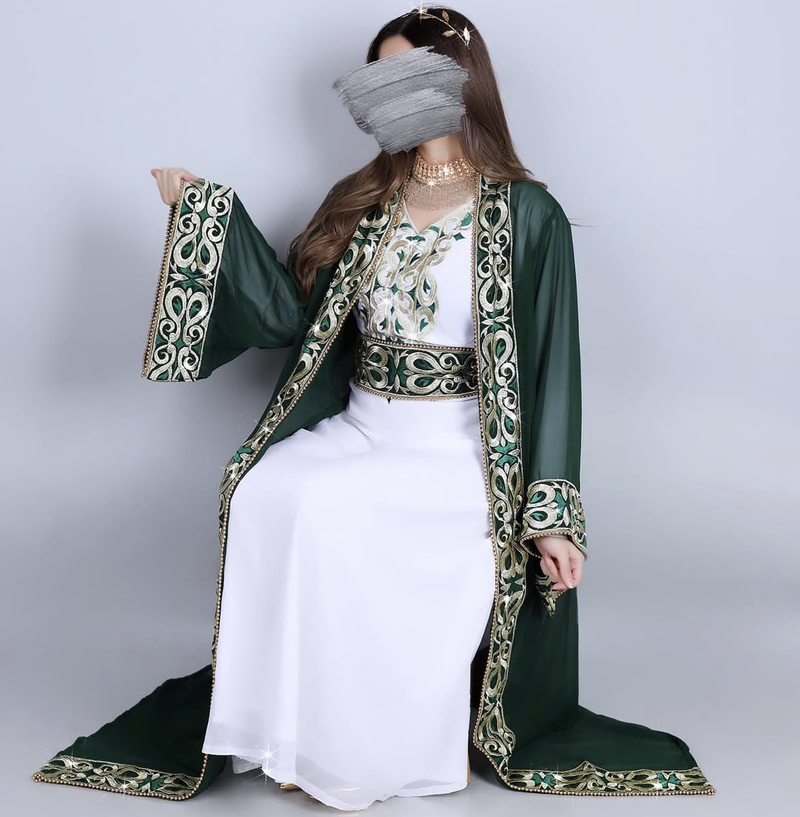 Step Into Elegance And Charm With This Beautiful Green And White Moroccan Kaftan, Designed To Bring Out Your Inner Grace And Confidence. This Stunning Outfit Is A Perfect Mix Of Traditional Moroccan Style And Modern Elegance, Making It Suitable For Weddings, Parties, And Festive Occasions.