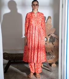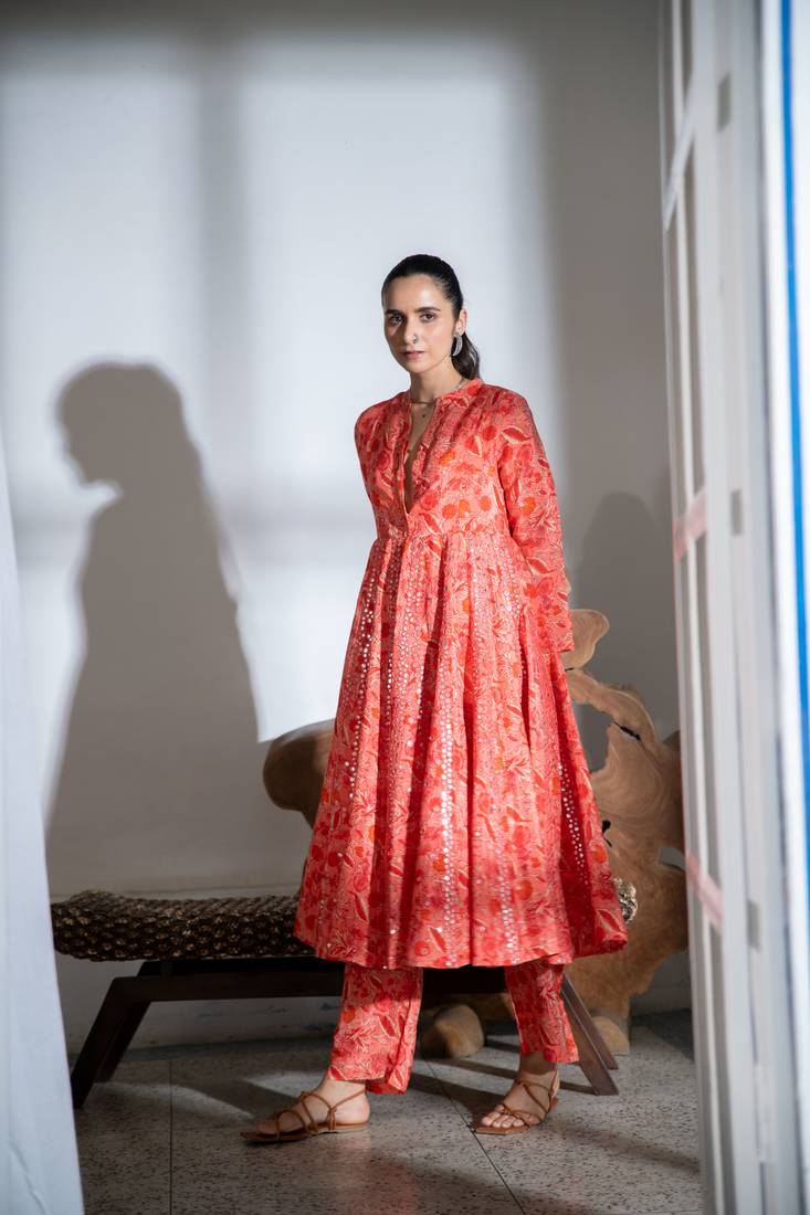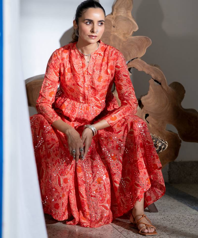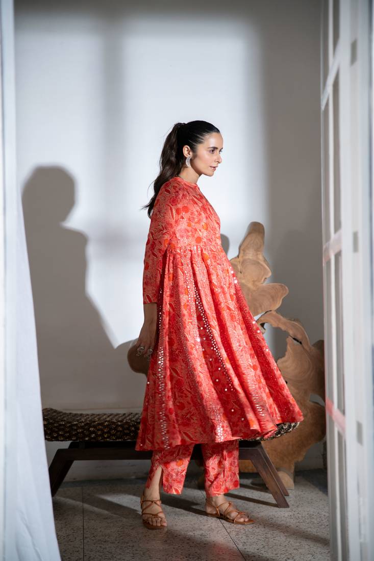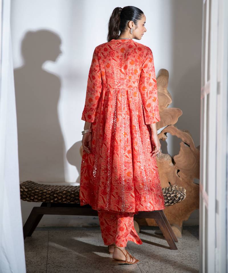 Orange embroidered satin kali kurta set