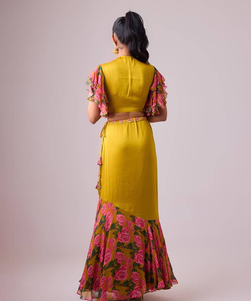 | Product Description | Yellow Modal Satin And Georgette Rose Printed Fish Cut Lehenga, Embroidered With Rose Applique Detailing Paired With Front Knotted Modal Satin And Georgette Rose Printed Tieresd Sleeves Blouse With Beautiful Rose Printed Dupatta.