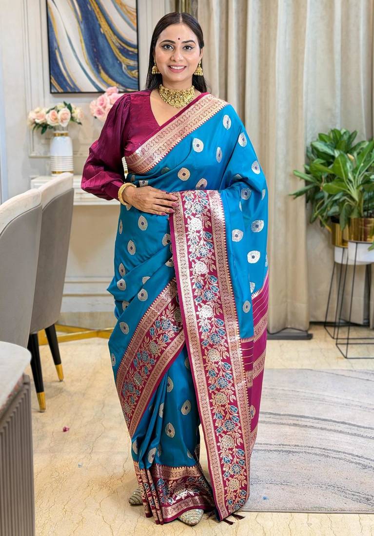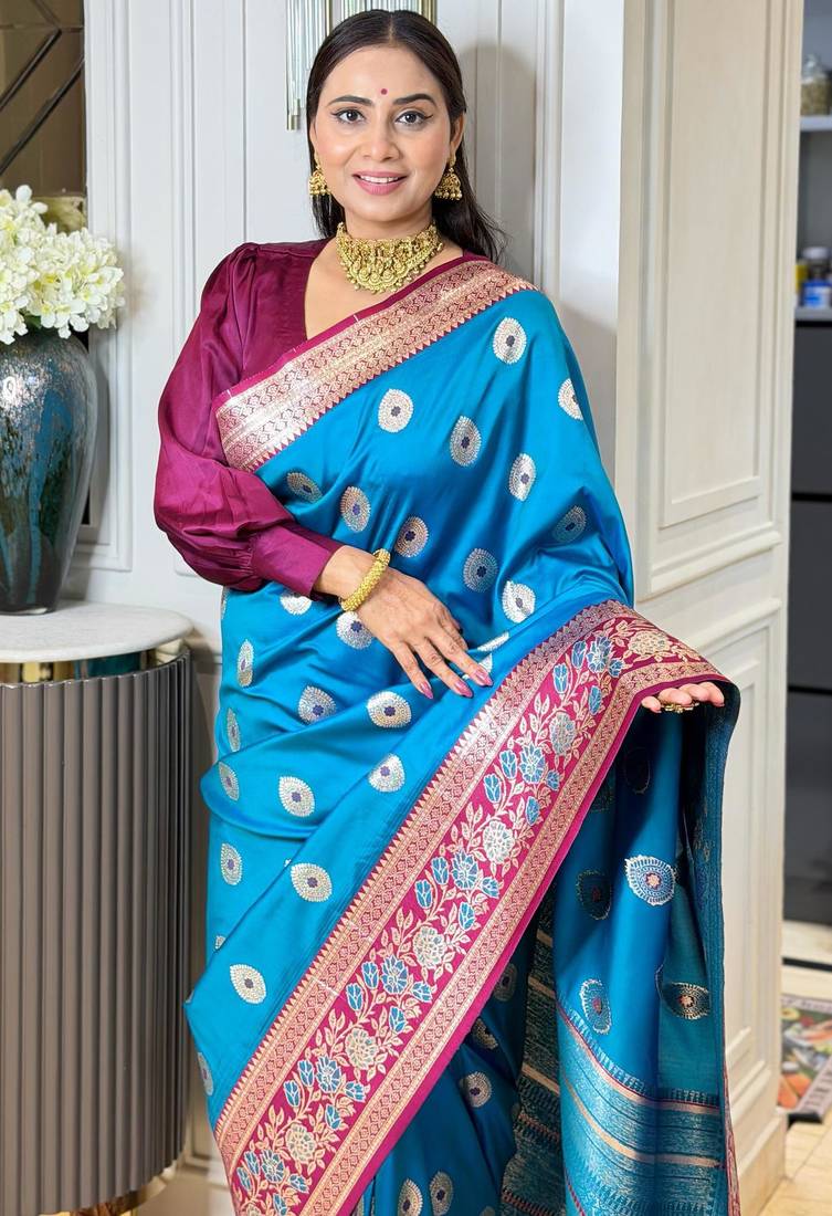 Blue color art silk saree with contrast blouse