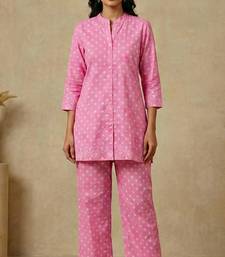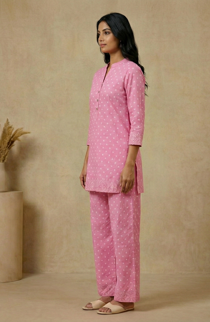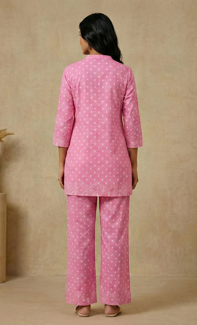 | Product Description | Light Pink Printed Cotton Co Ord Set, Featuring A Premium Mandarin Collar And Matching Pants. The Pastel Shade And Soft Print Make It Ideal For Office, Casual Wear, Light Outings, Travel, And Everyday Styling. |