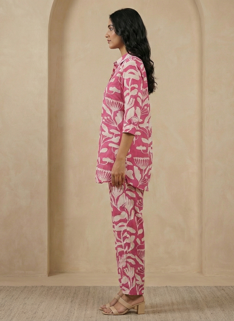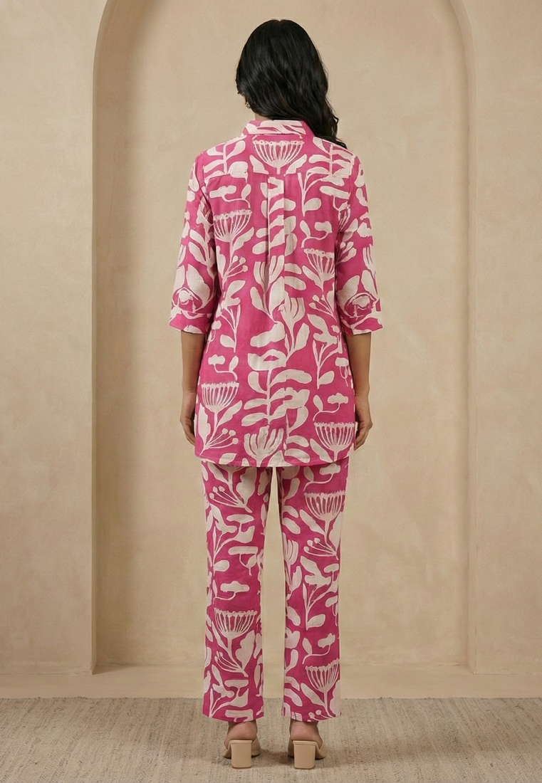 | Product Description | This Pink Floral Cotton Co Ord Set Is Designed For Women Who Love A Graceful Blend Of Elegance And Comfort. Featuring A Stylish Shirt Collar Top And Coordinated Pants, The Set Is Perfect For Office, Daily Wear, Social Outings, And Travel.