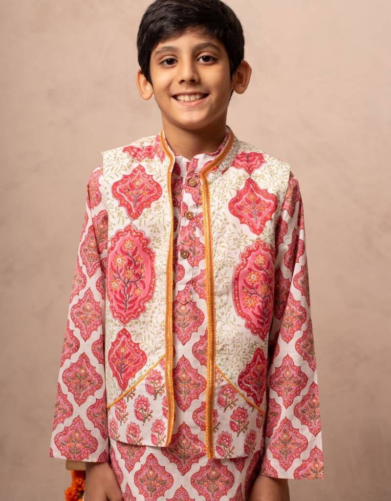 | Product Description | Dress Your Little One In The Charming Hawa Hawai Bandi Jacket Set, Featuring A Soft Pink Kurta With A Delicate Lace Detail Open Jacket And Crisp White Dhoti Pants. This Playful Ensemble Blends Traditional Style With A Fresh, Fun Look, Perfect For Festive Occasions Or Family Gatherings. Comfortable And Stylish, It Lets Boys Move Freely While Looking Absolutely Adorable. |