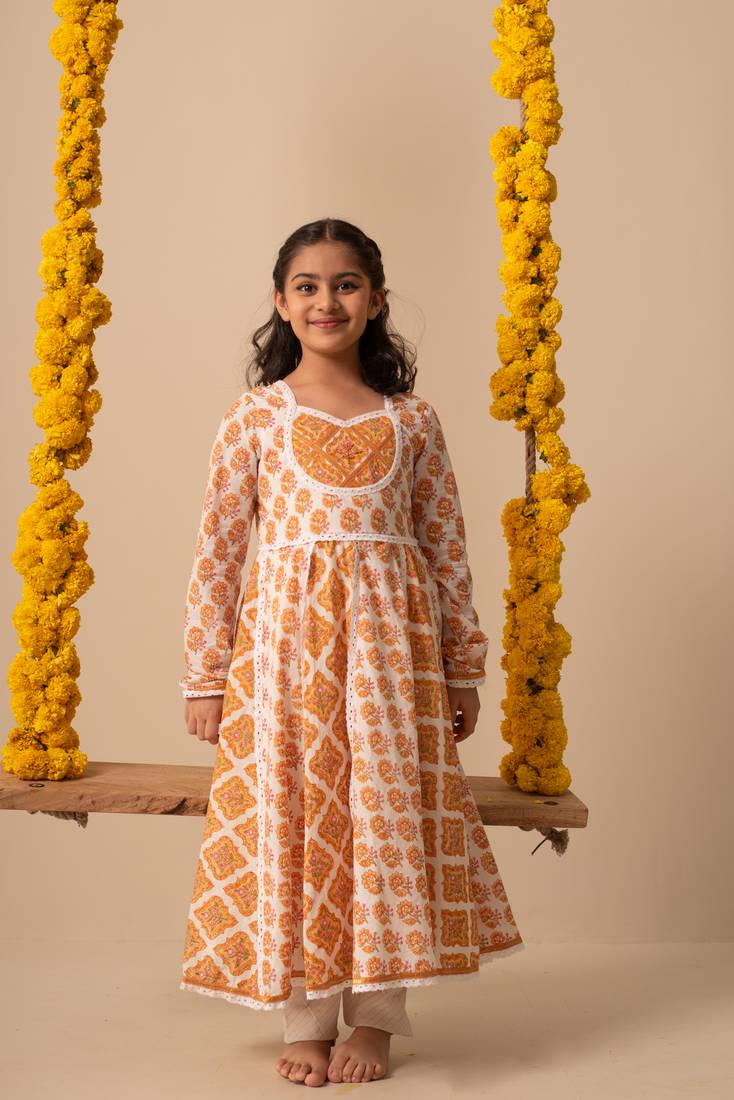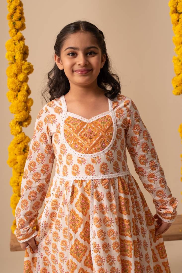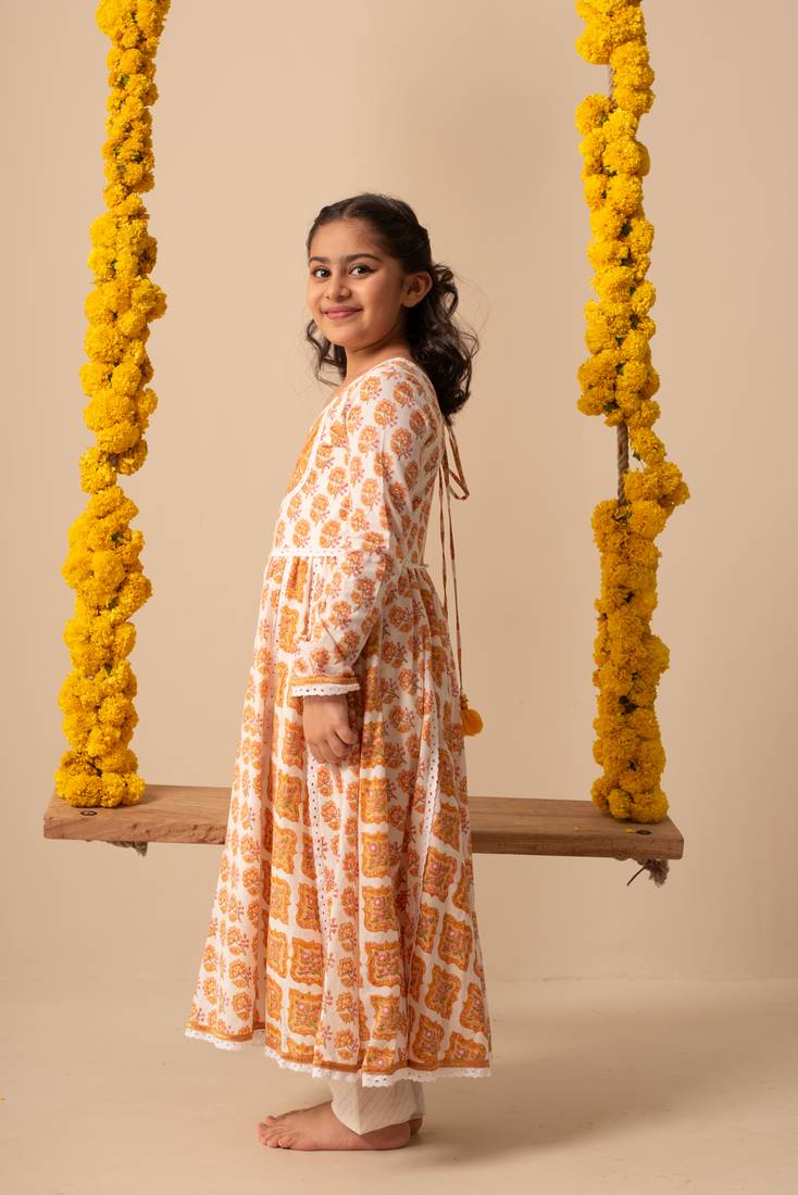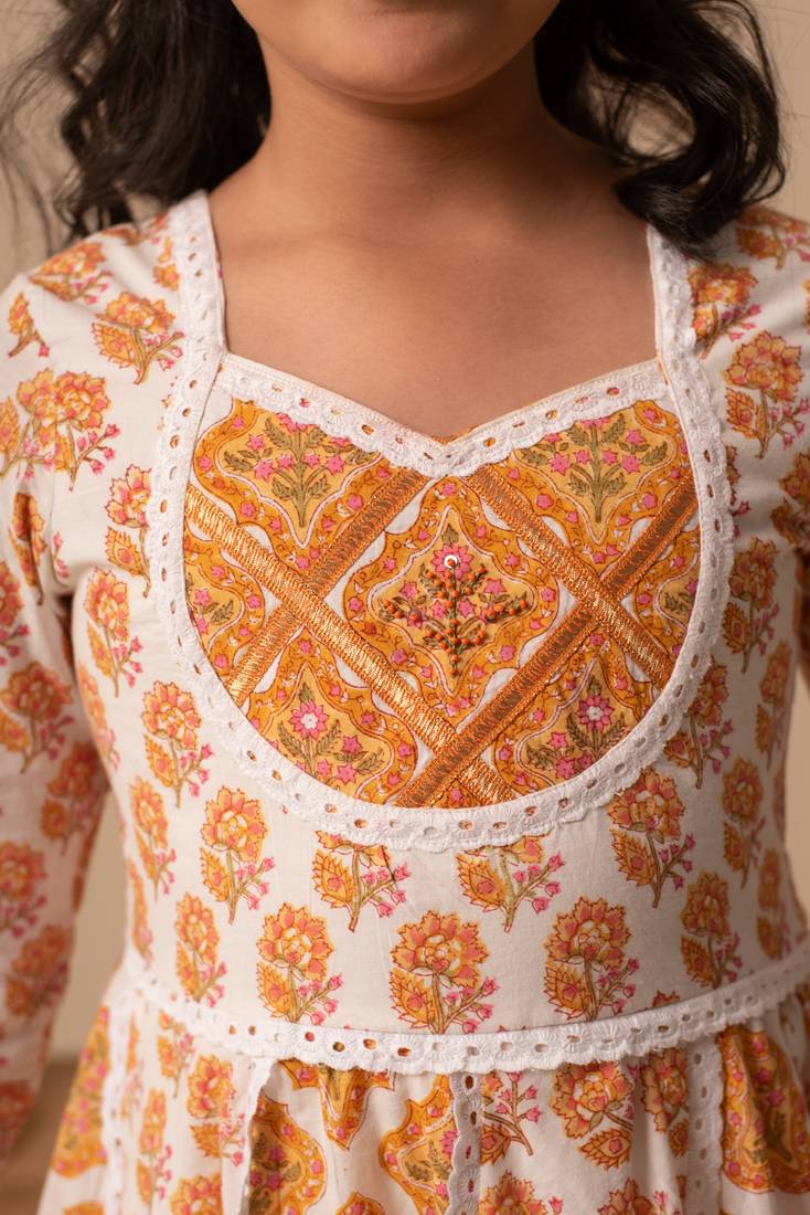 | Product Description | This Charming Kalidar Anarkali Kurta Set Includes A Churidar Pant And A Matching Dupatta, Designed To Delight Your Little One. The Center Motif Is Beautifully Highlighted With Delicate Embroidery, While The Entire Outfit Is Adorned With Soft Cotton Lace. Perfectly Crafted For Twirling And Play, This Set Combines Comfort And Style For Your Little Girl's Special Moments. |