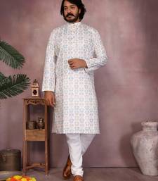 | Product Name | White Floral Printed Blended Cotton Band Collar Men S Kurta Pyjama Set Festive & Trendy | |