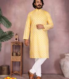 Yellow woven blended cotton thread work kurta with band collar & white pyjama set for men
