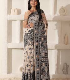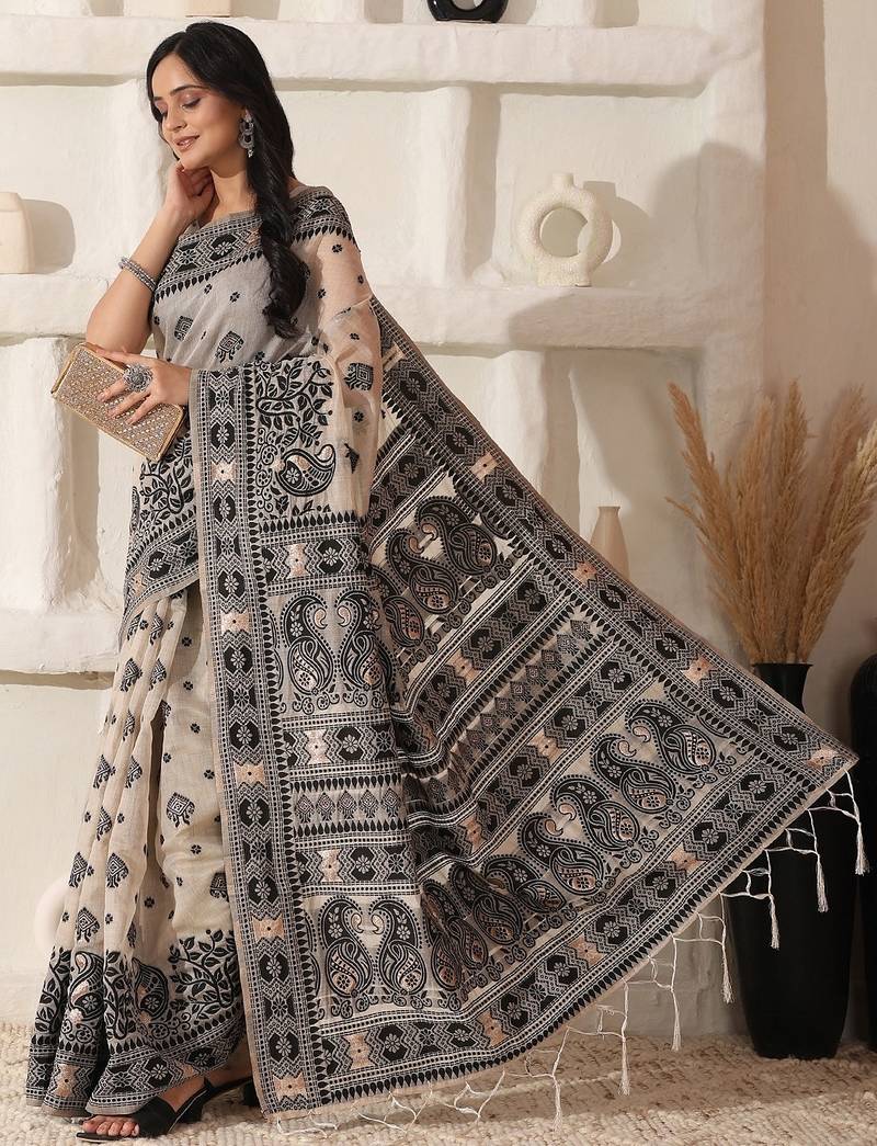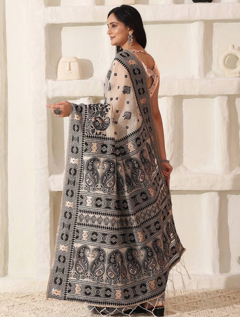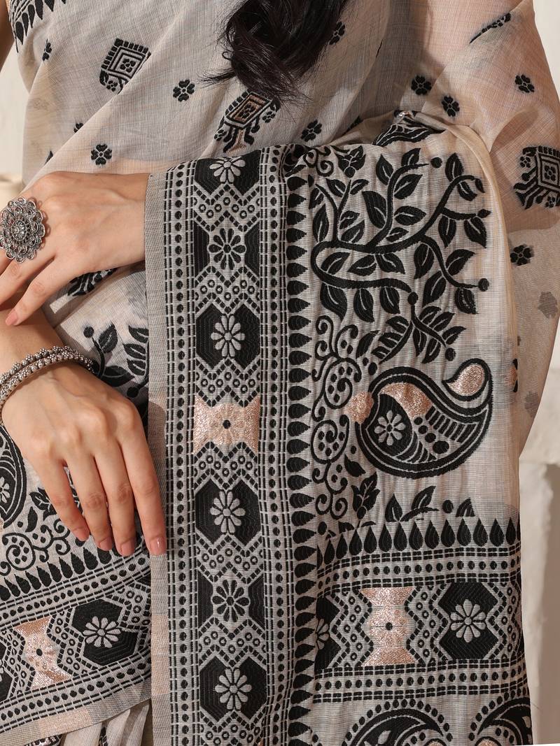 Product Name Cream & Black Color Linen Cotton Saree With Blouse