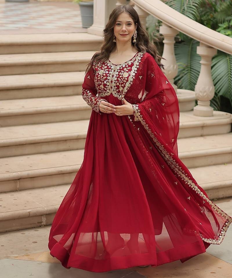 | Product Name | Maroon Color Multi Sequins & Zari Embroidered Work Georgette Gown With Dupatta | |