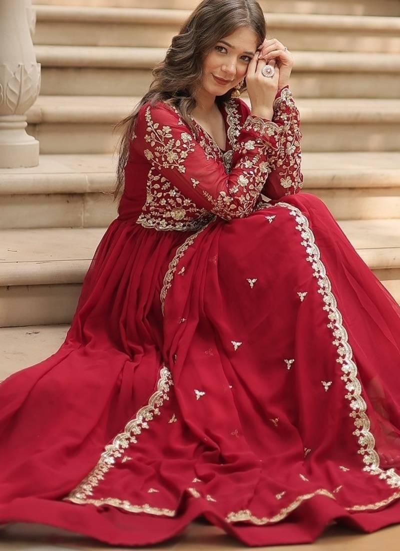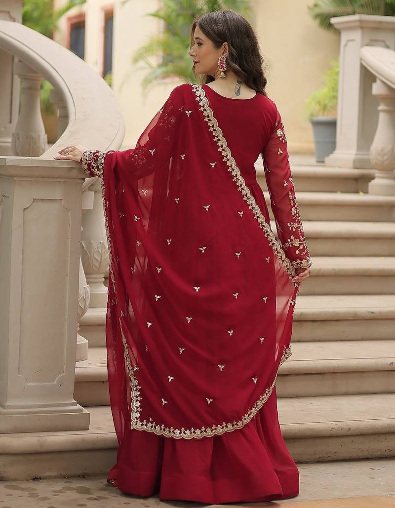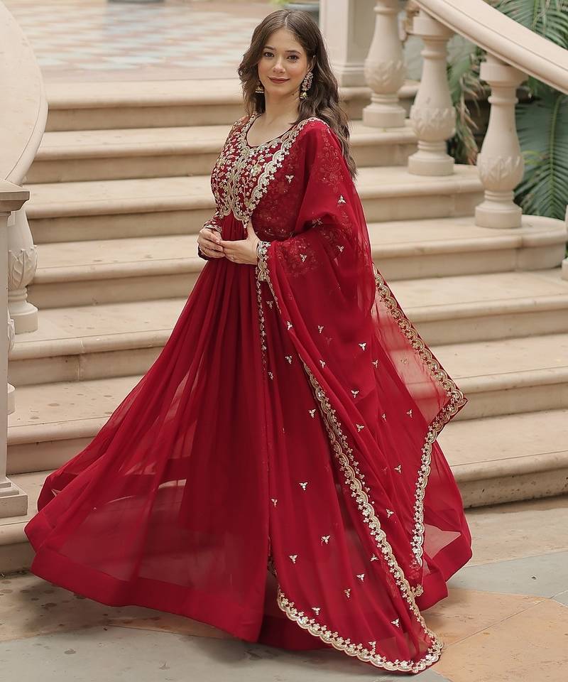 Maroon color multi sequins & zari embroidered work georgette gown with dupatta stitched