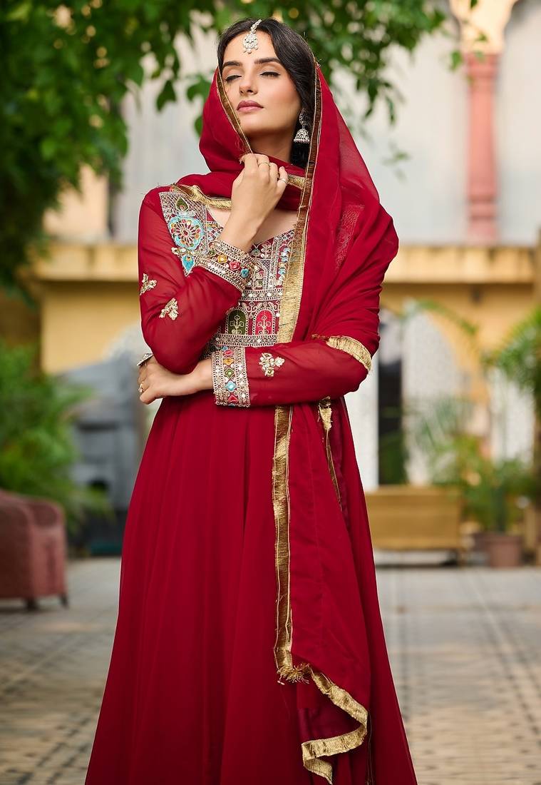 Maroon color multi thread sequins embroidered georgette gown dupatta stitched