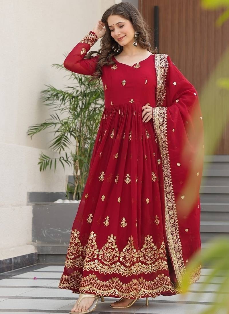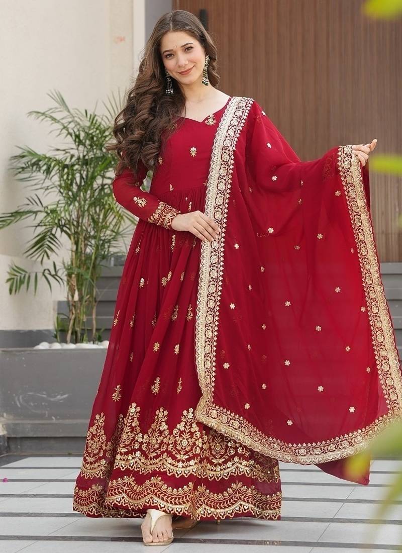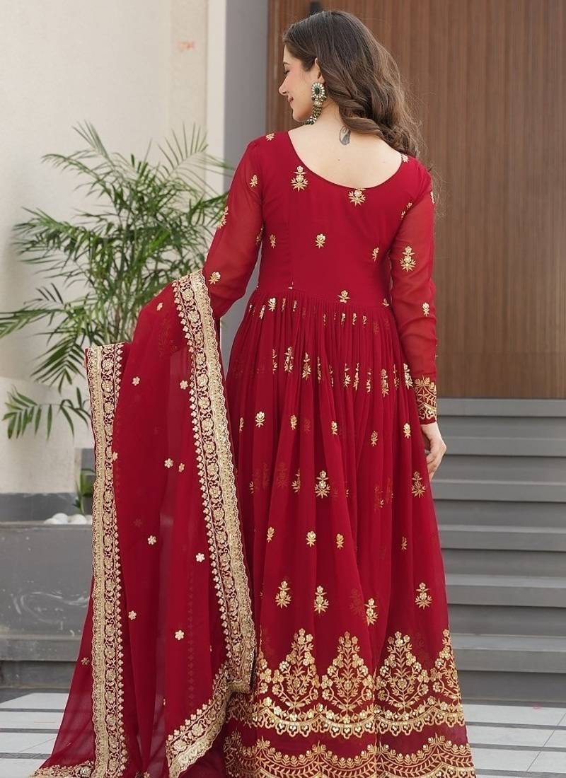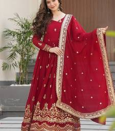 Maroon color zari sequins embroidered work georgette gown dupatta stitched