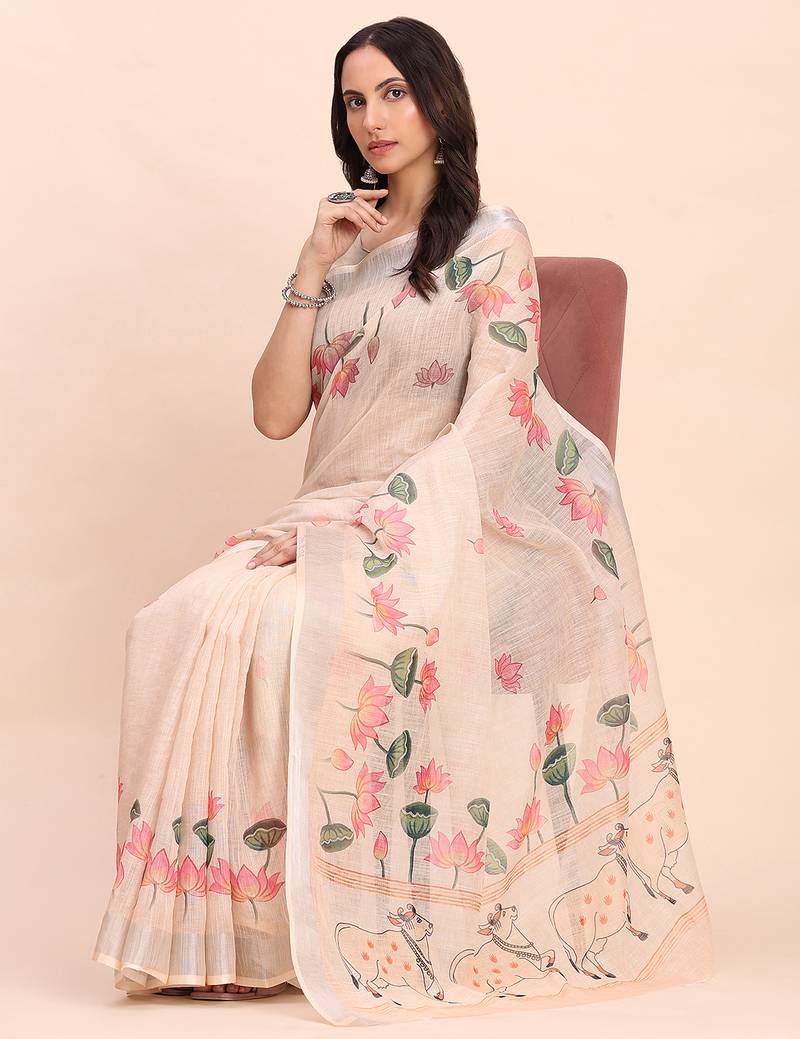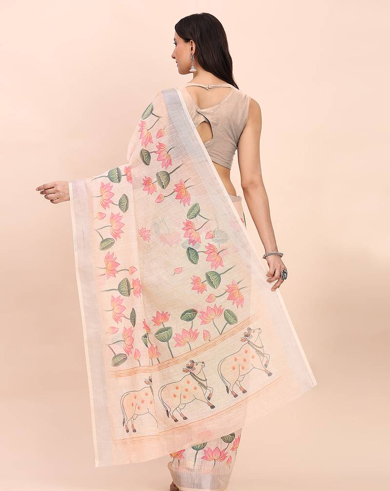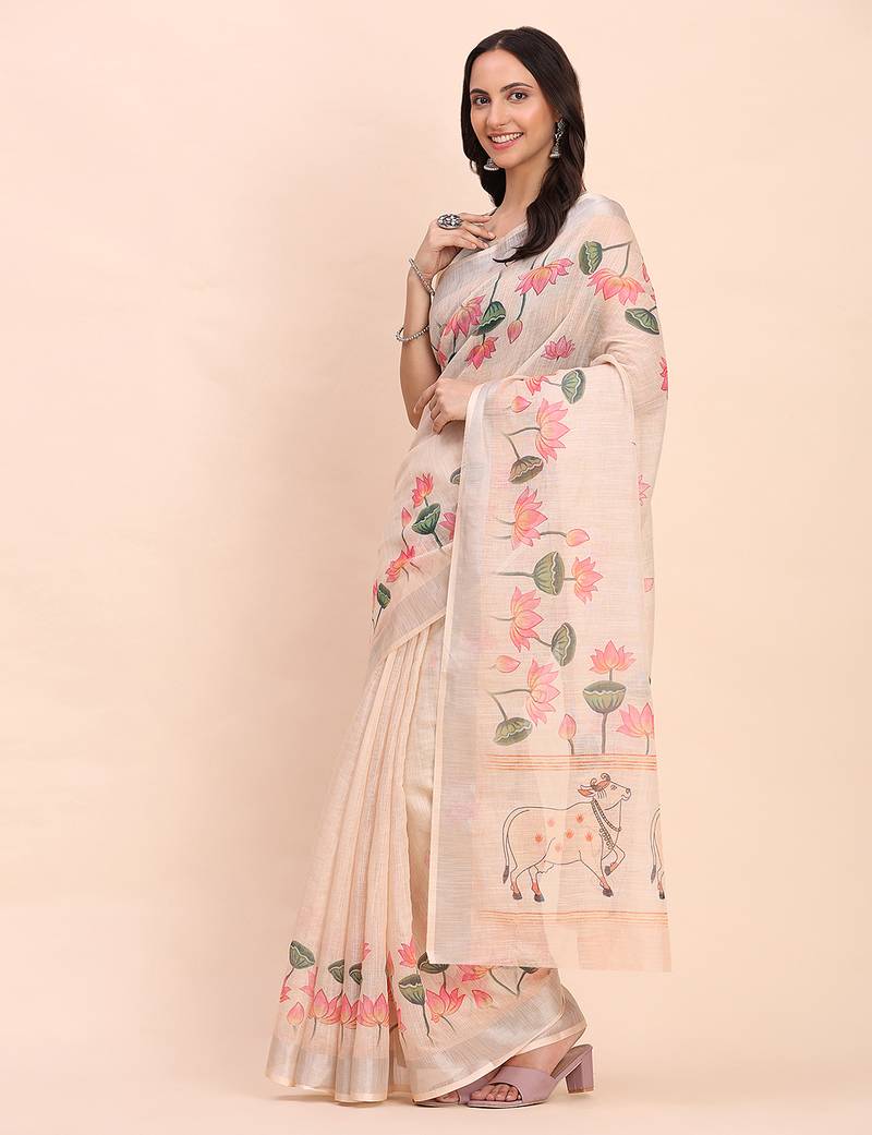 Product Name Peach Color Digital Print & Zari Border Linen Cotton Saree