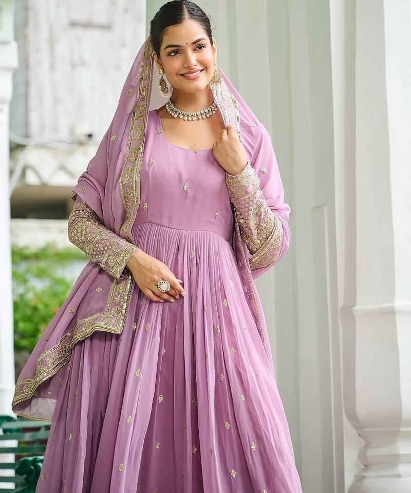 | Product Description | Unique Dusty Coloured Faux Georgette With Embroidered Work 3 Mtr Flair Cotton (Full Inner Top To Bottom) Stitched With Canvas Patta Gown With Faux Georgette With Rich Sequins And Embroidered Work Dupatta. |