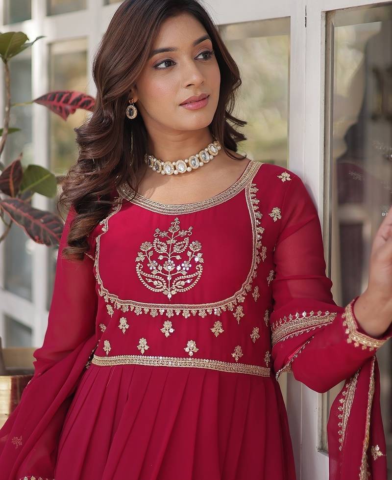 Get Ready To Shine With These Stunning Outfit Made From Faux Blooming And Sequins Embroidered Work. Discover The Perfect Ensemble To Add A Touch Of Glamour To Your Wardrobe And Stand Out From The Crowd.3.5 Mtr Flair,Cotton (Full Inner Top To Bottom),Stitched With Canvas Patta,With Faux Blooming Georgette With Attractive Lace And Embroidered Work Dupatta.