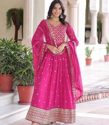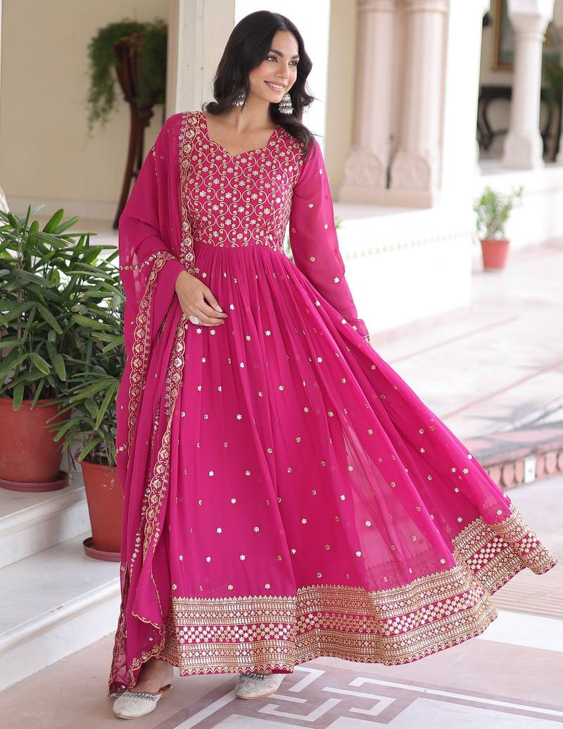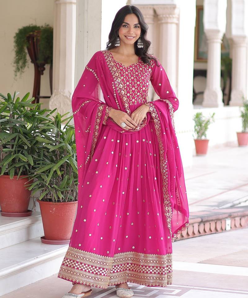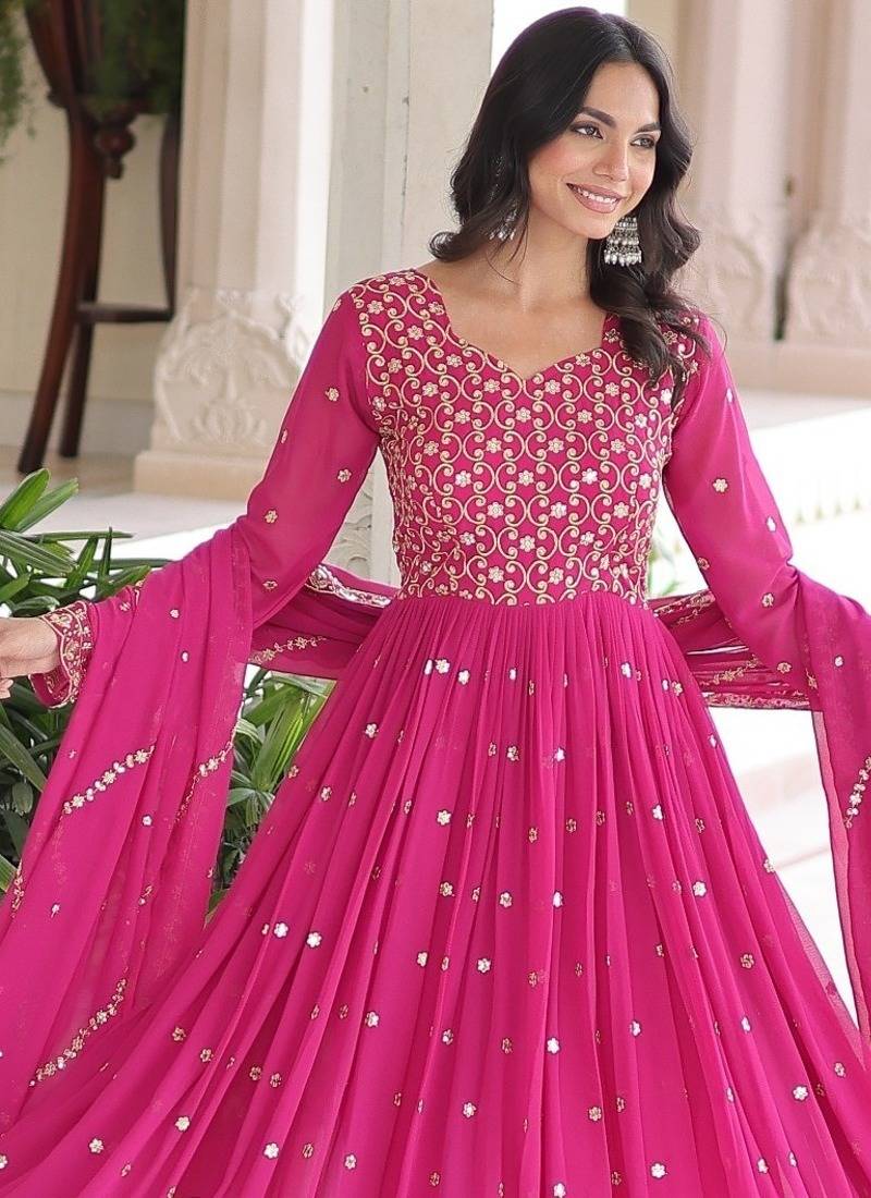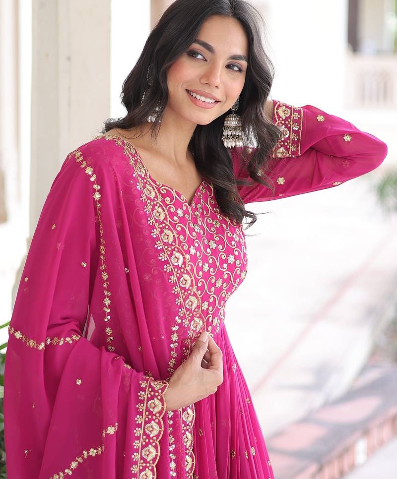 Pink color zari sequins embroidered work georgette gown dupatta stitched