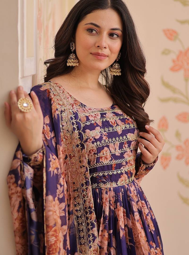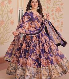Purple color digital printed with sequins work russian silk gown dupatta