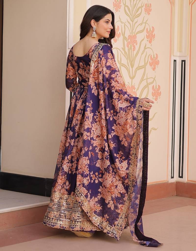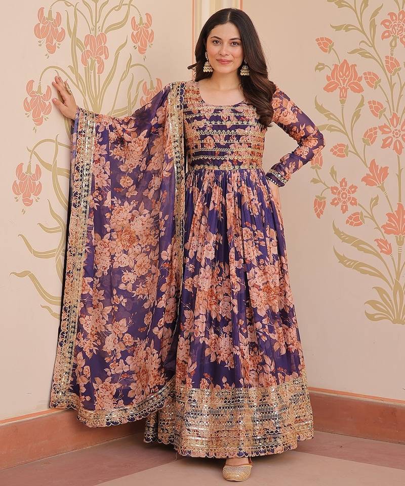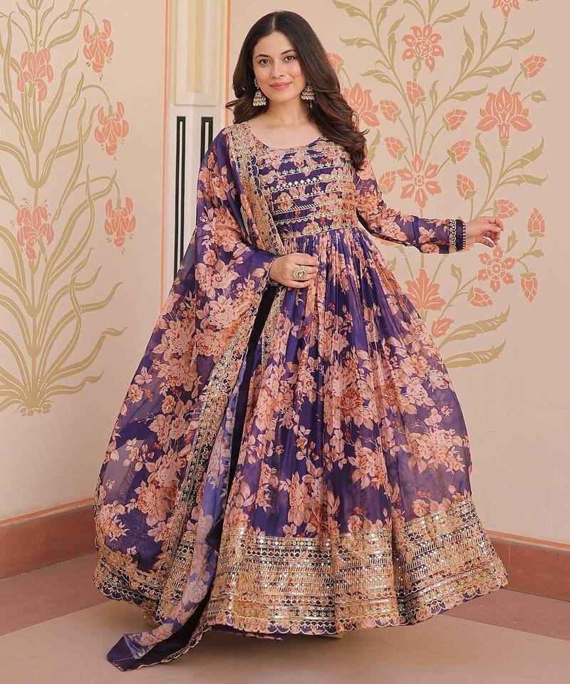 Purple color digital printed with sequins work russian silk gown dupatta stitched