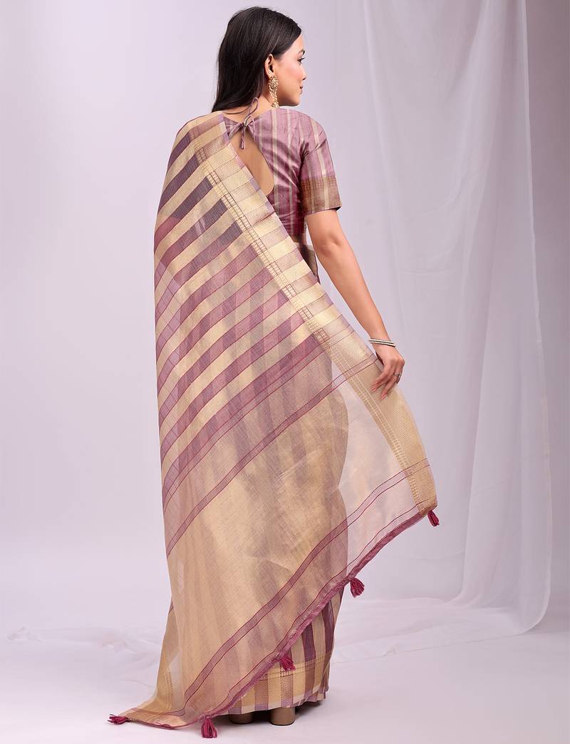 Purple color zari border work orgenza stripe saree with blouse