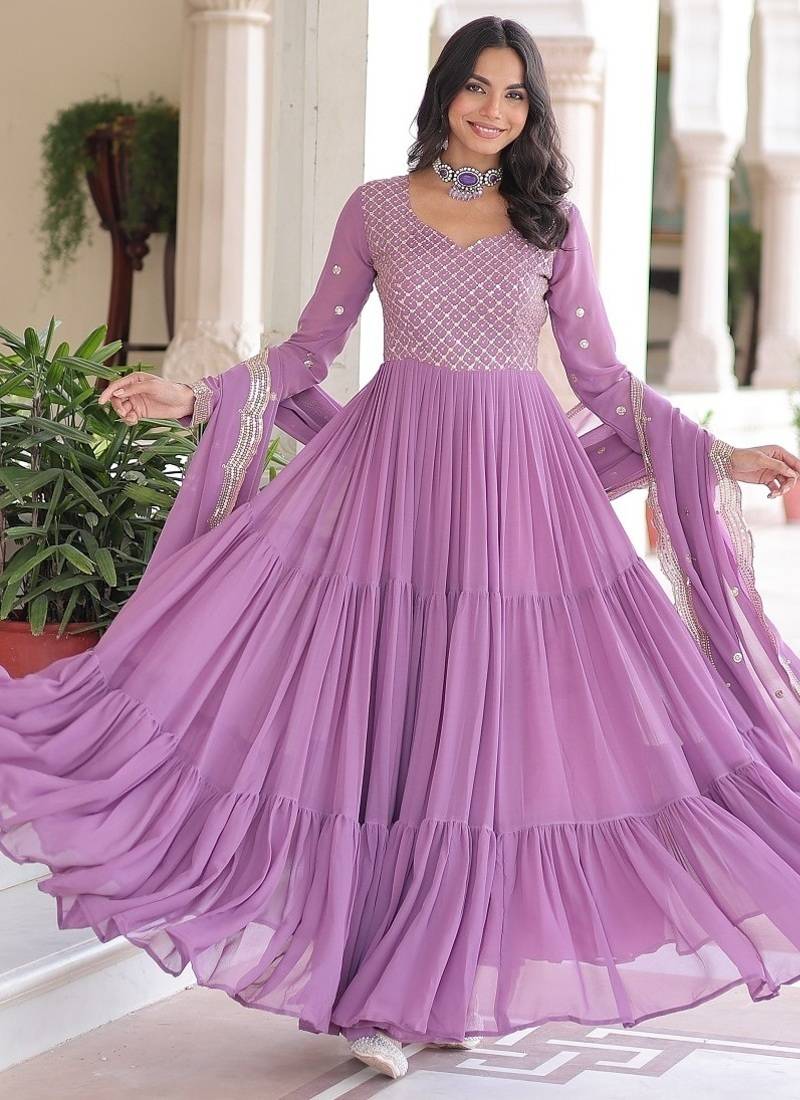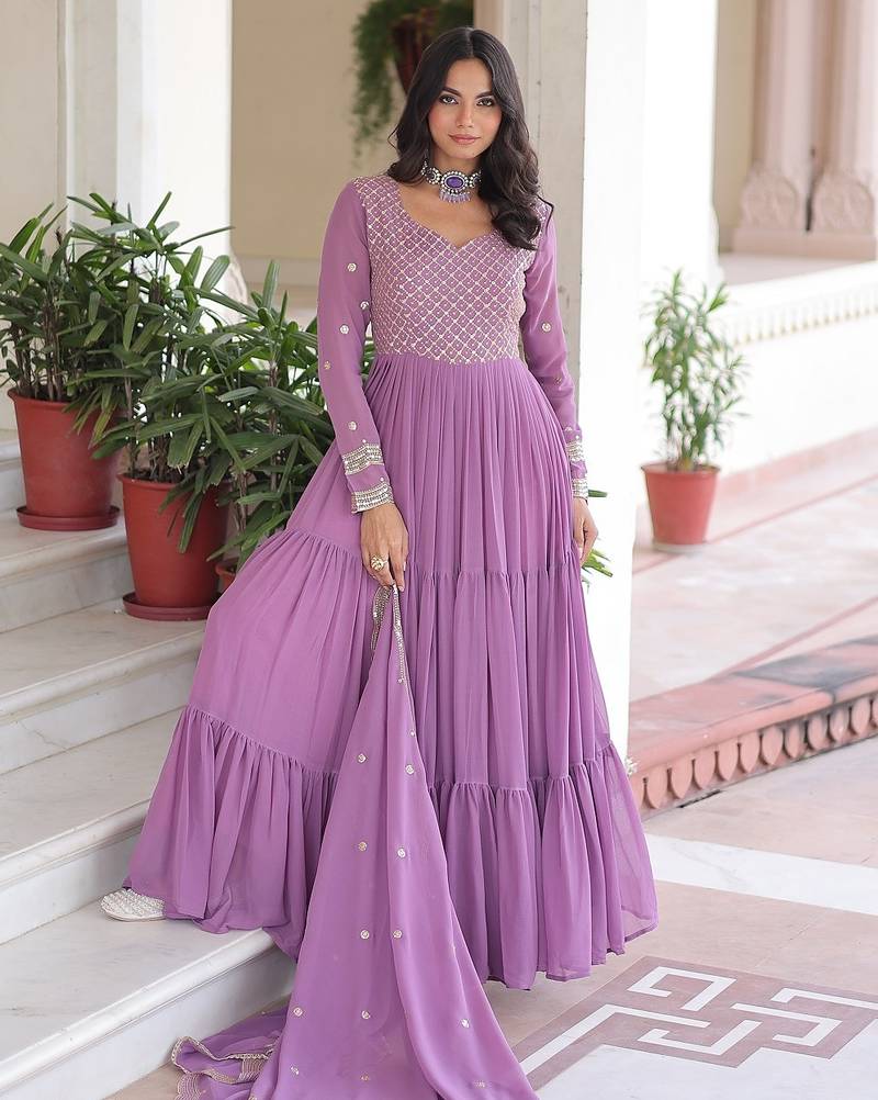 Purple color zari sequins embroidered work georgette gown dupatta stitched