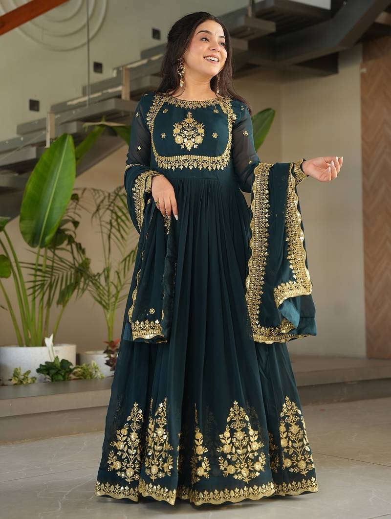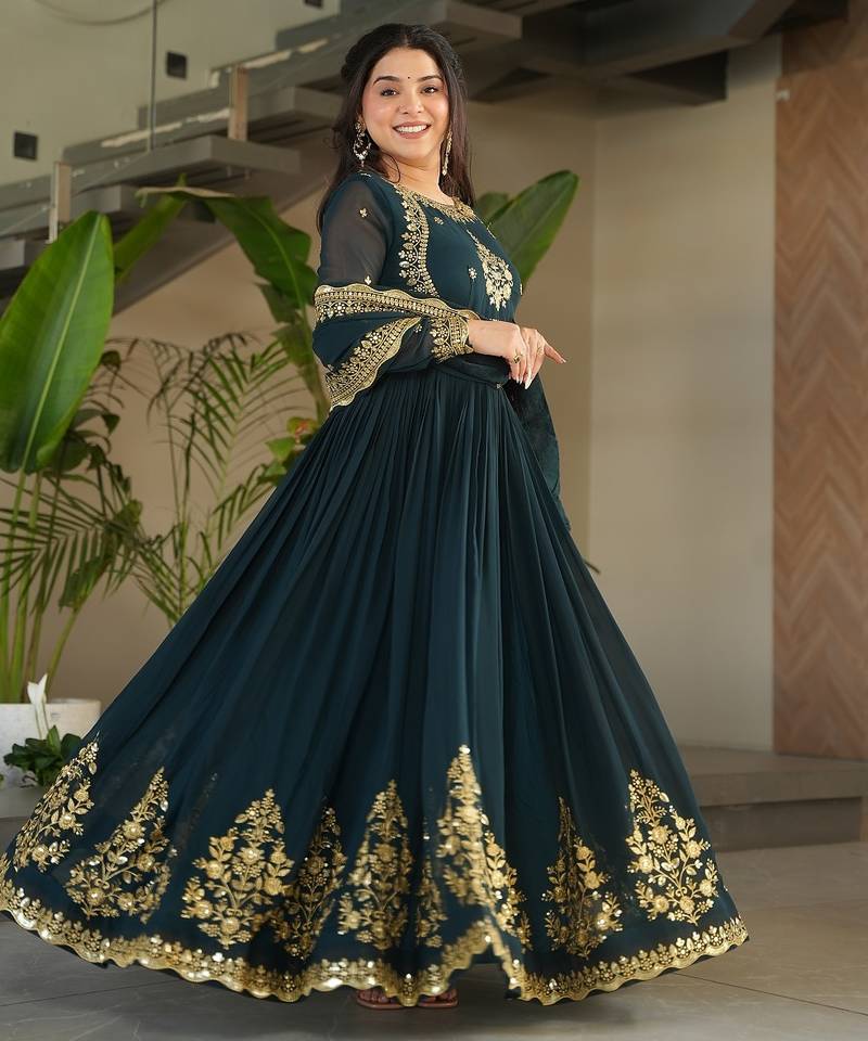 Designer Gown Is Luxury Clothing Considered To Be High Quality Made By Zari Thread & Sequins Embroidery. This Is Made For Desirable Women's Who Deserve It. 3.5 Mtr Flair ,Cotton (Full Inner Top To Bottom),Faux Blooming With Reach Embroidery Sequence Work Dupatta.