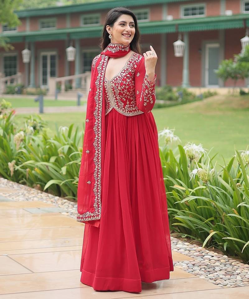 | Product Name | Red Color Multi Sequins & Zari Embroidered Work Georgette Gown With Dupatta | |