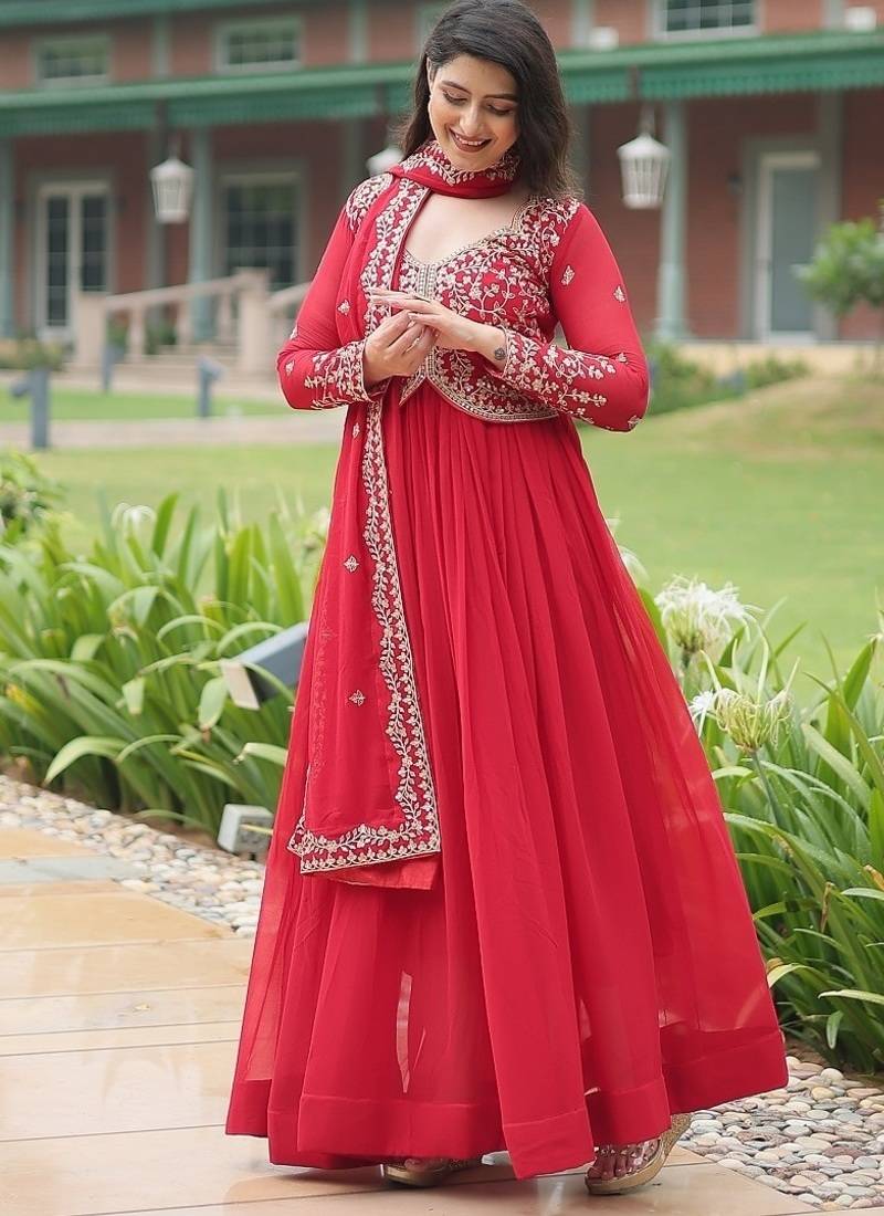 Red color multi sequins & zari embroidered work georgette gown with dupatta stitched