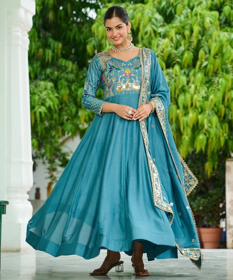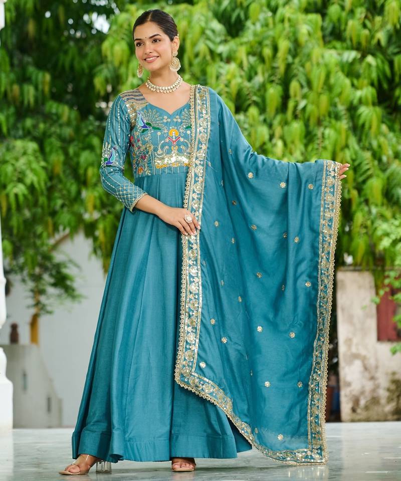Sky blue color threads sequins embroidered work vichitra silk gown dupatta stitched