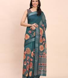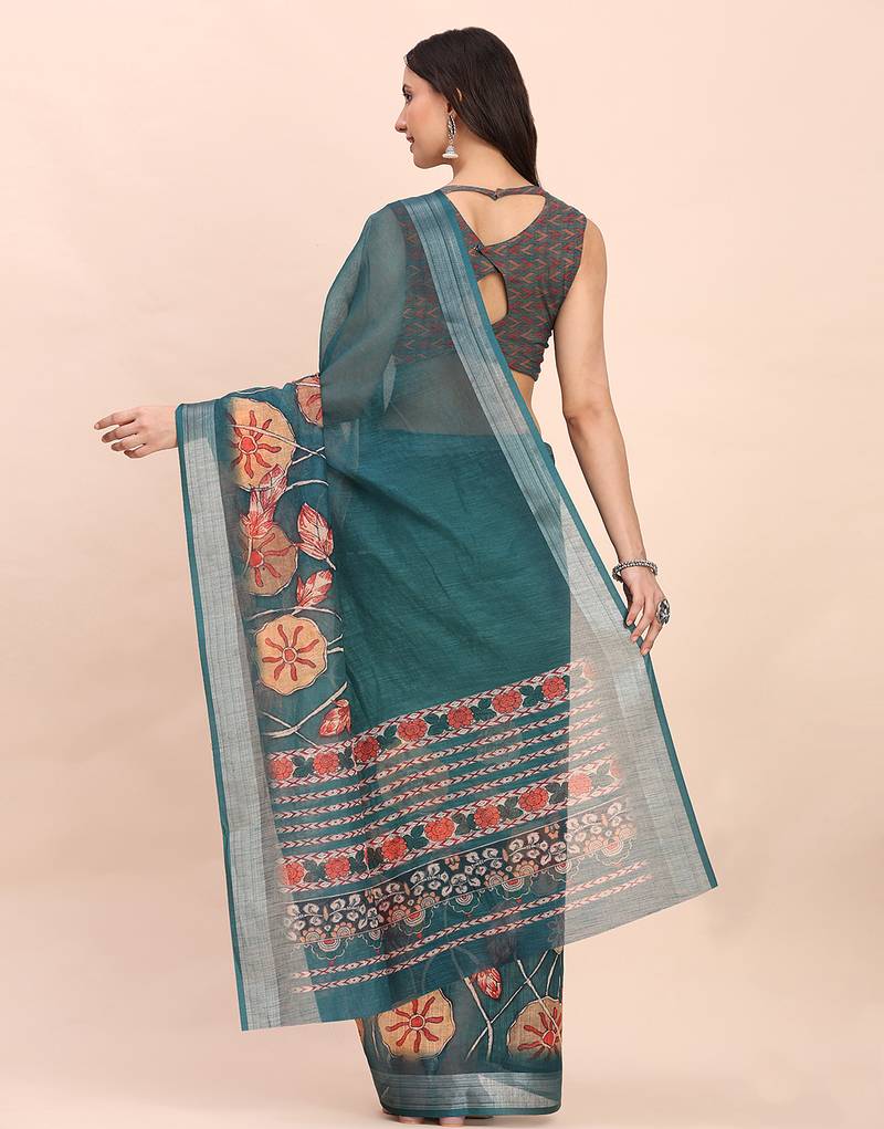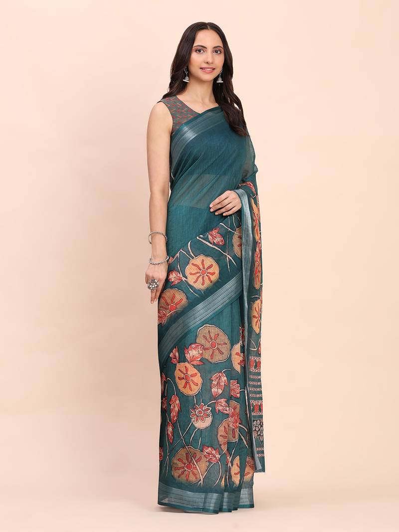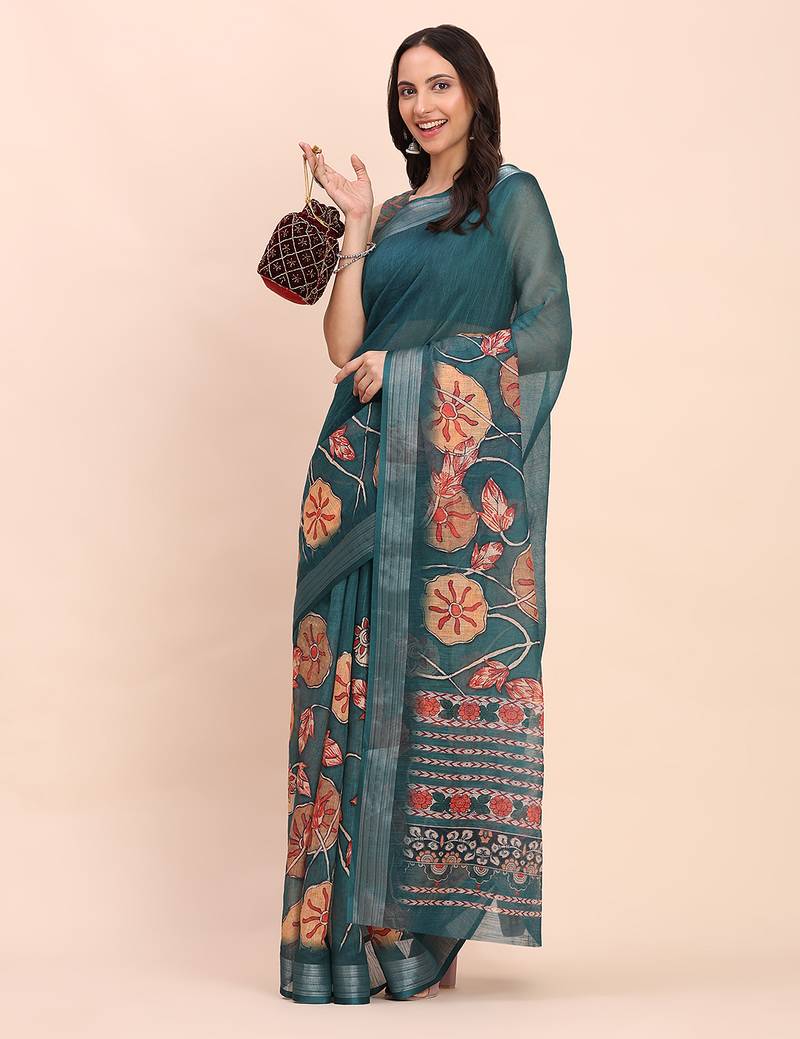 | Product Name | Teal Color Digital Print & Zari Border Linen Cotton Saree | |
