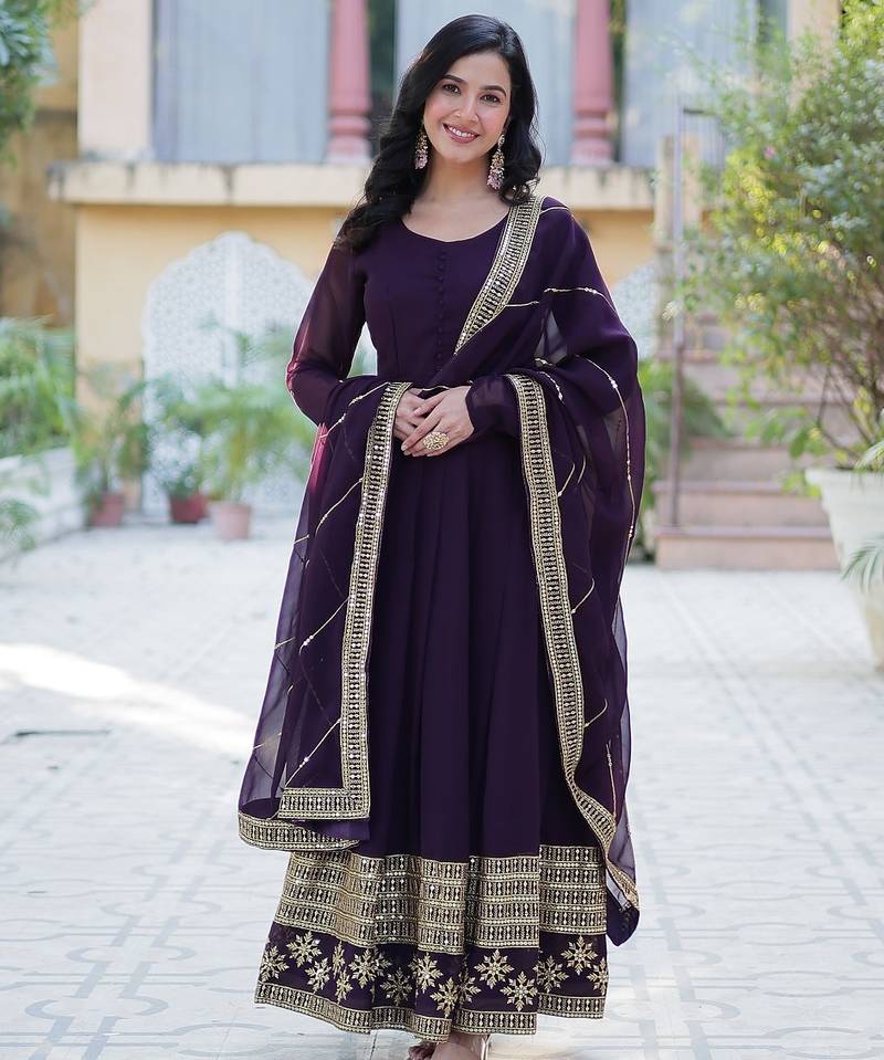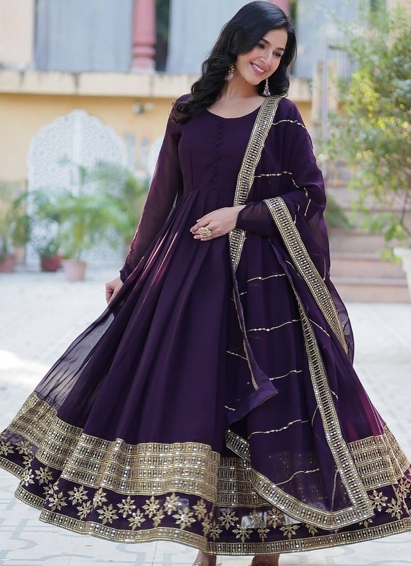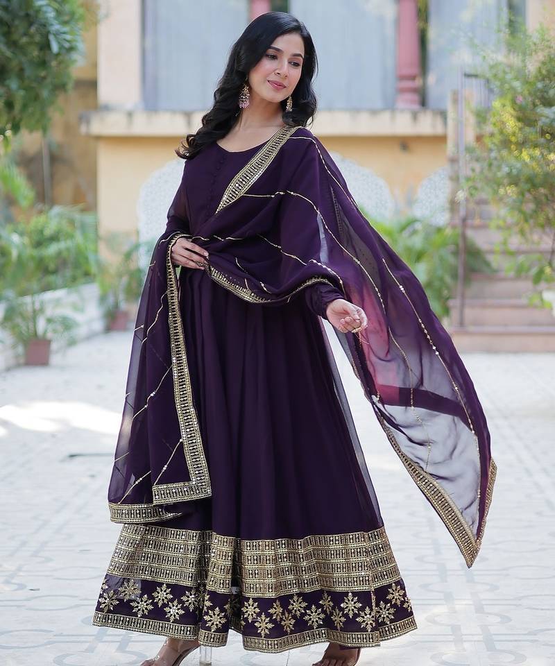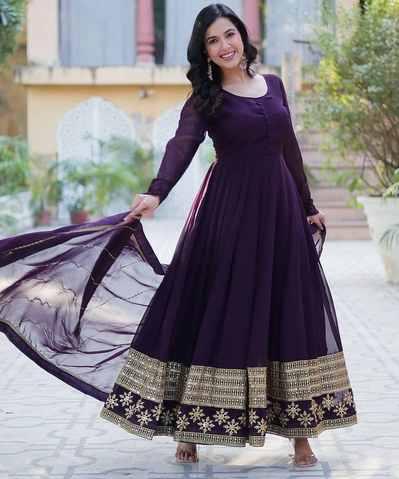 Wine color multi sequins embroidered work georgette gown with dupatta stitched