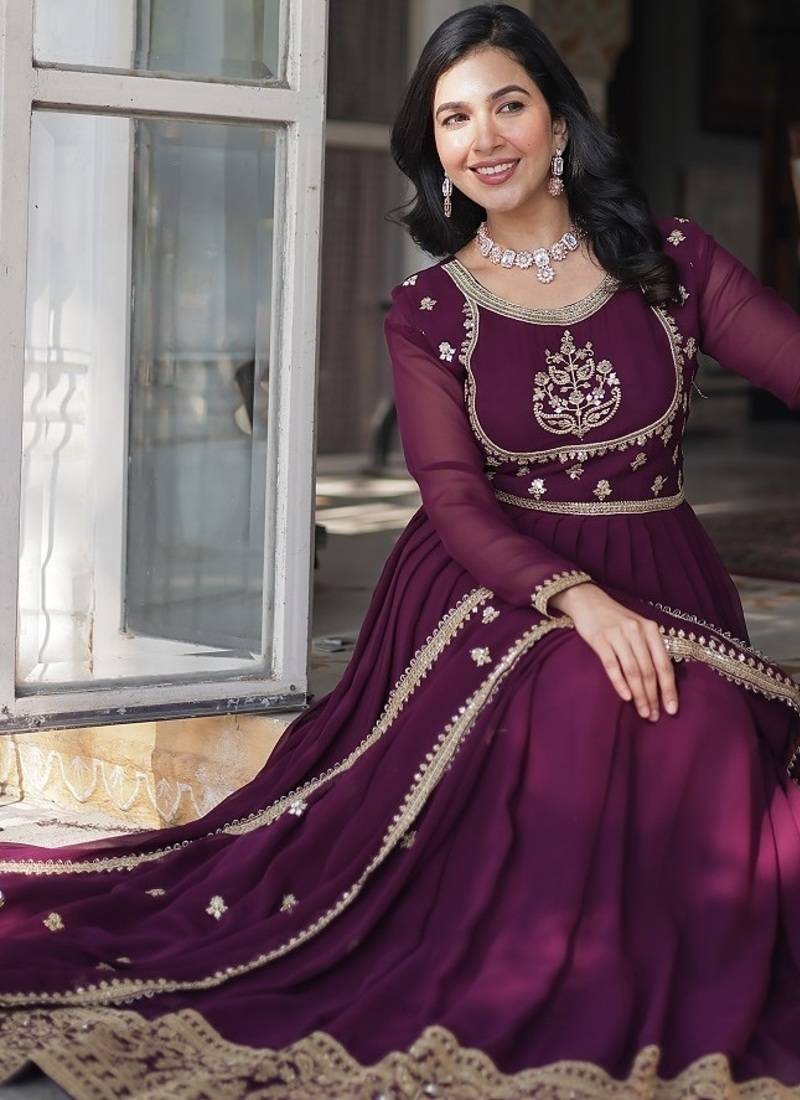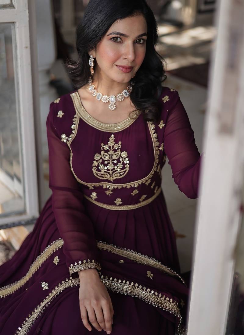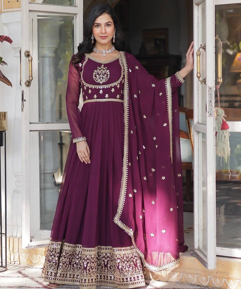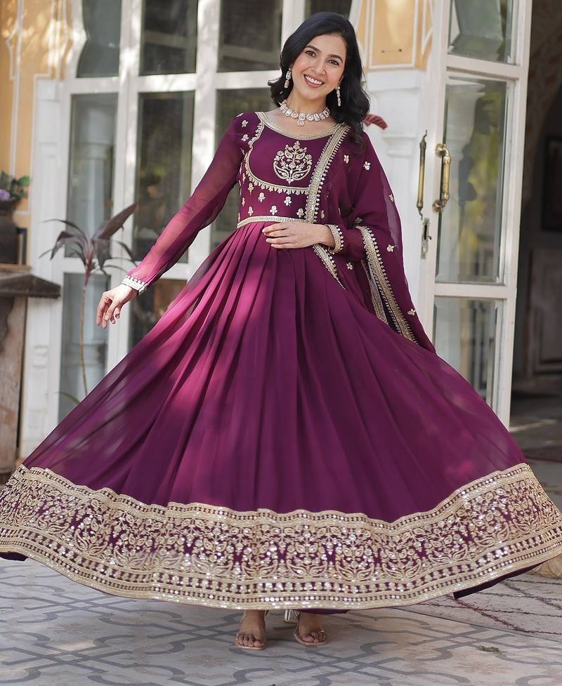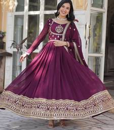 Wine color sequins embroidered work georgette gown with dupatta stitched