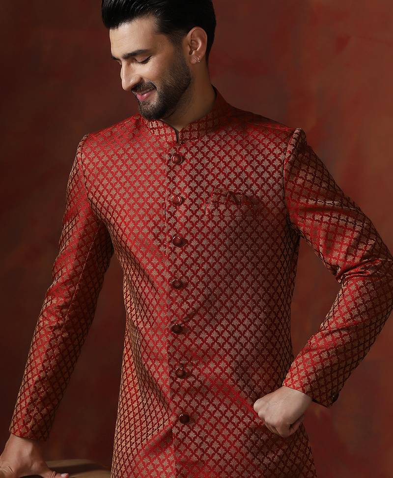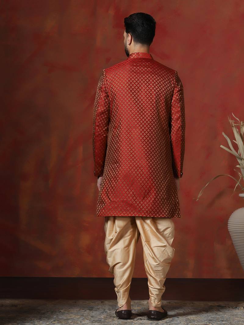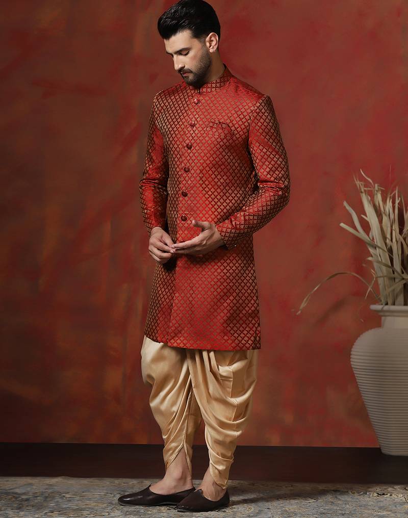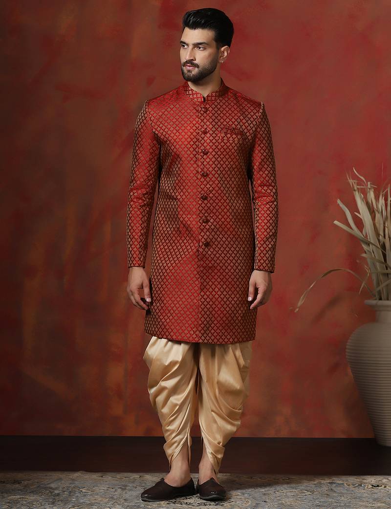 | Product Name | Red Jacquard Blend Indo Western And Dhoti Set For Men With Printed Design | |