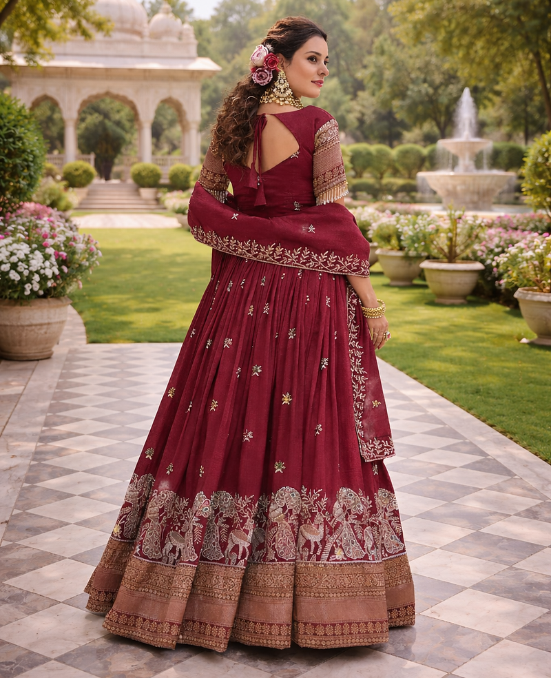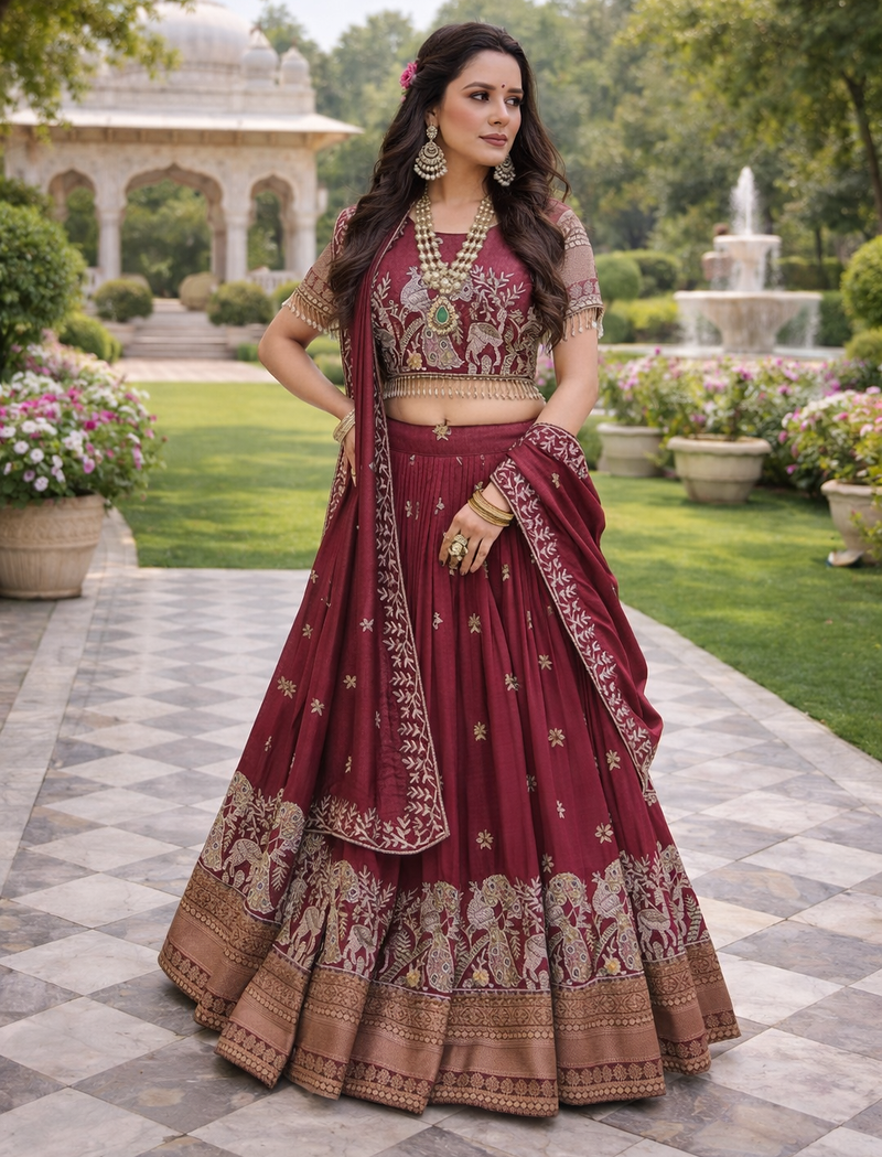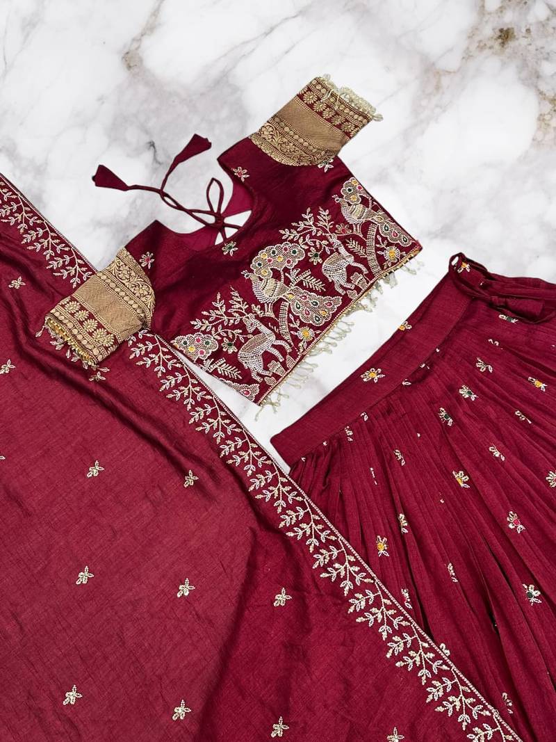 Maroon color embroidery sequence with thred work pure vichitra lehenga set
