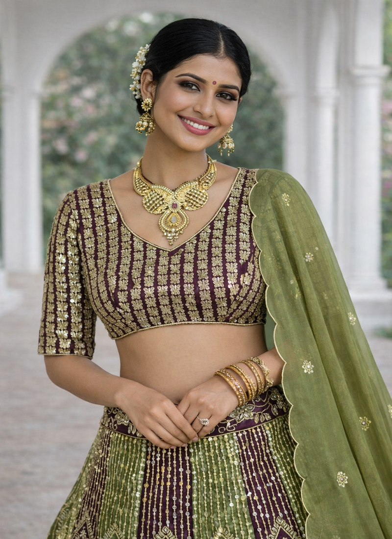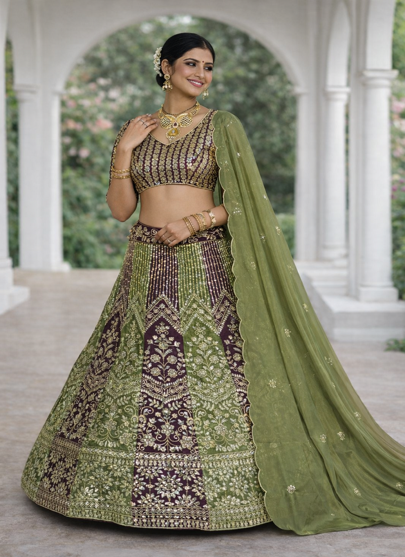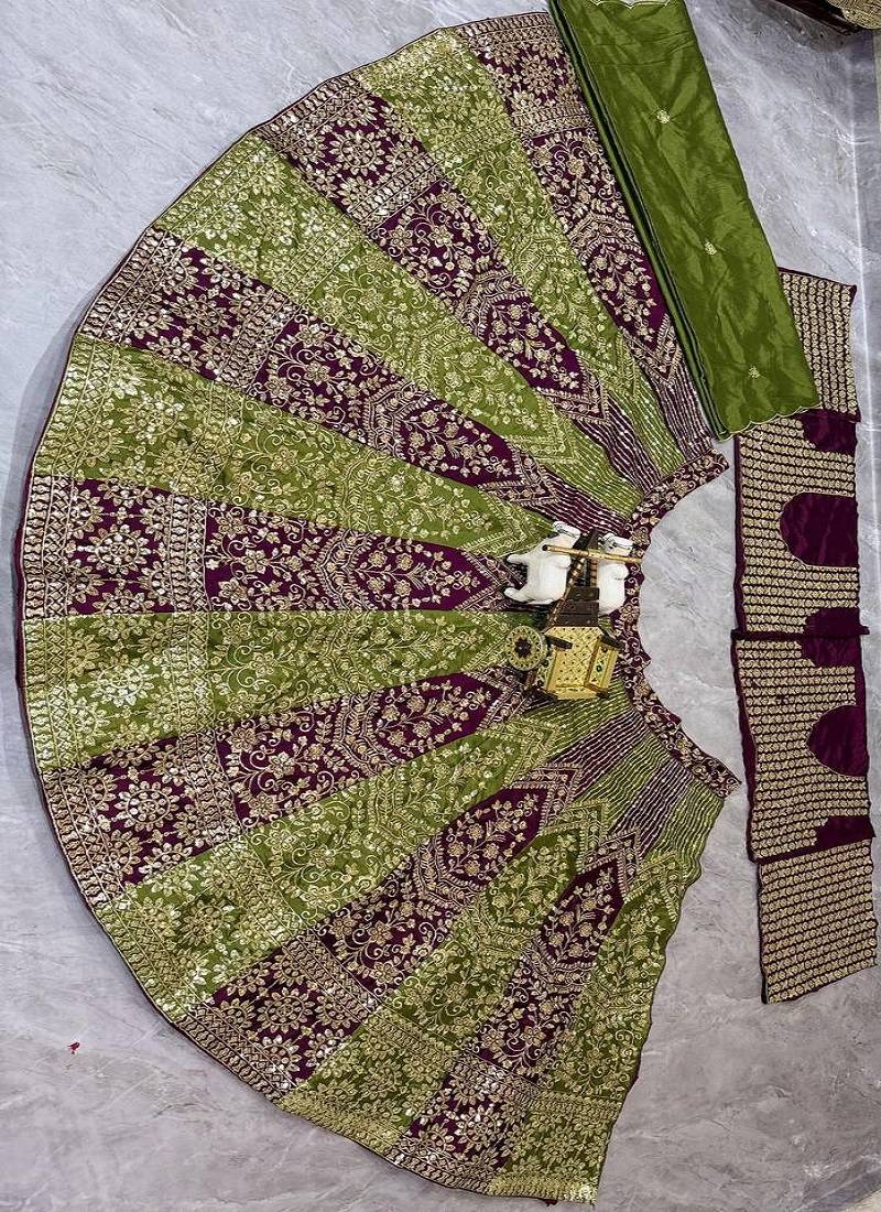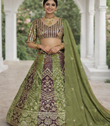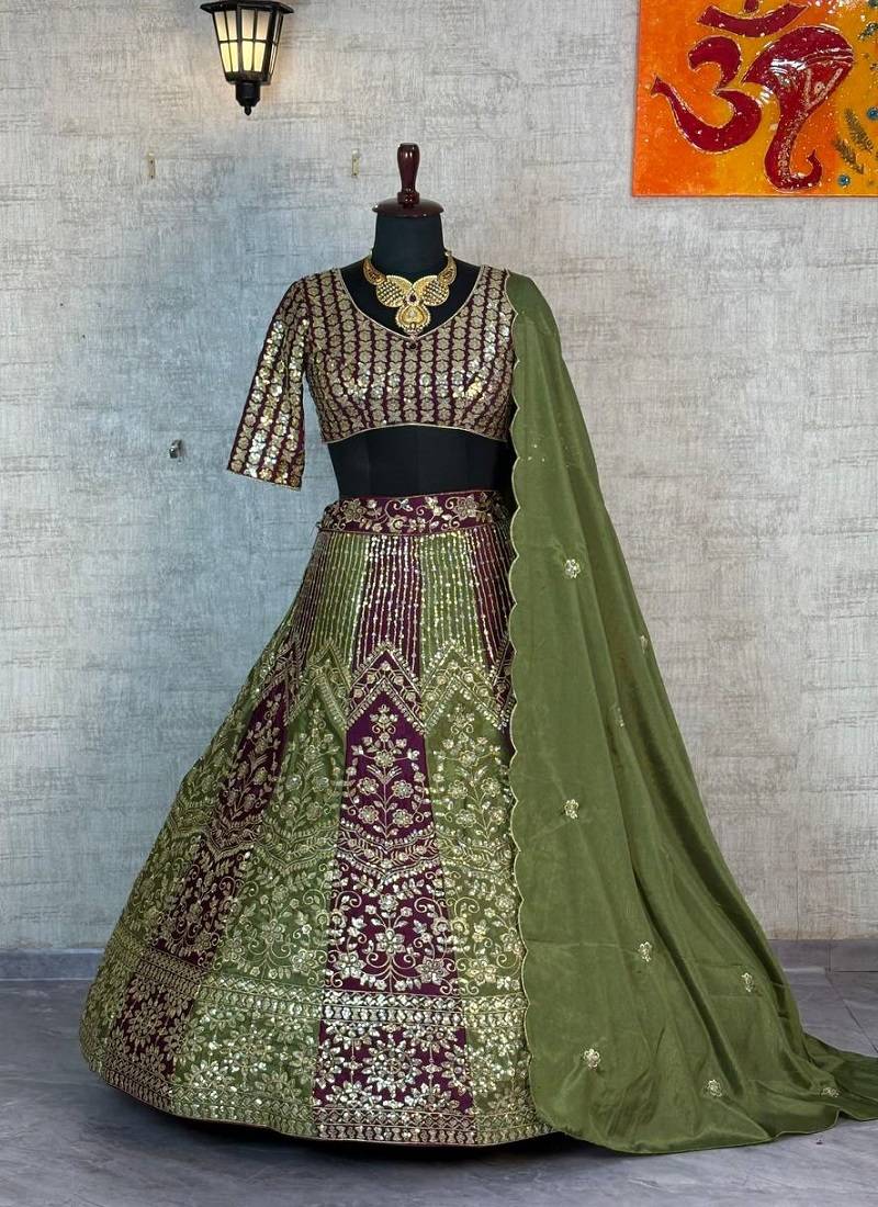 Olive color embroidery sequins work chinon silk lehenga choli dupatta silk