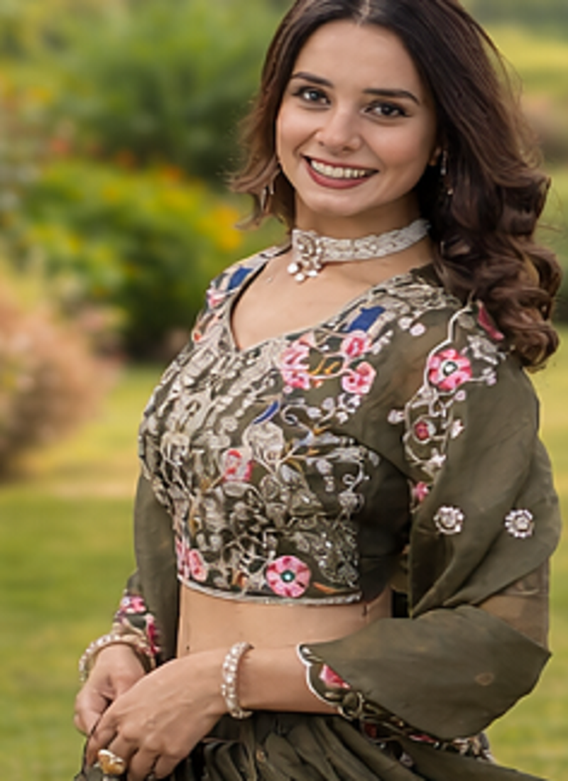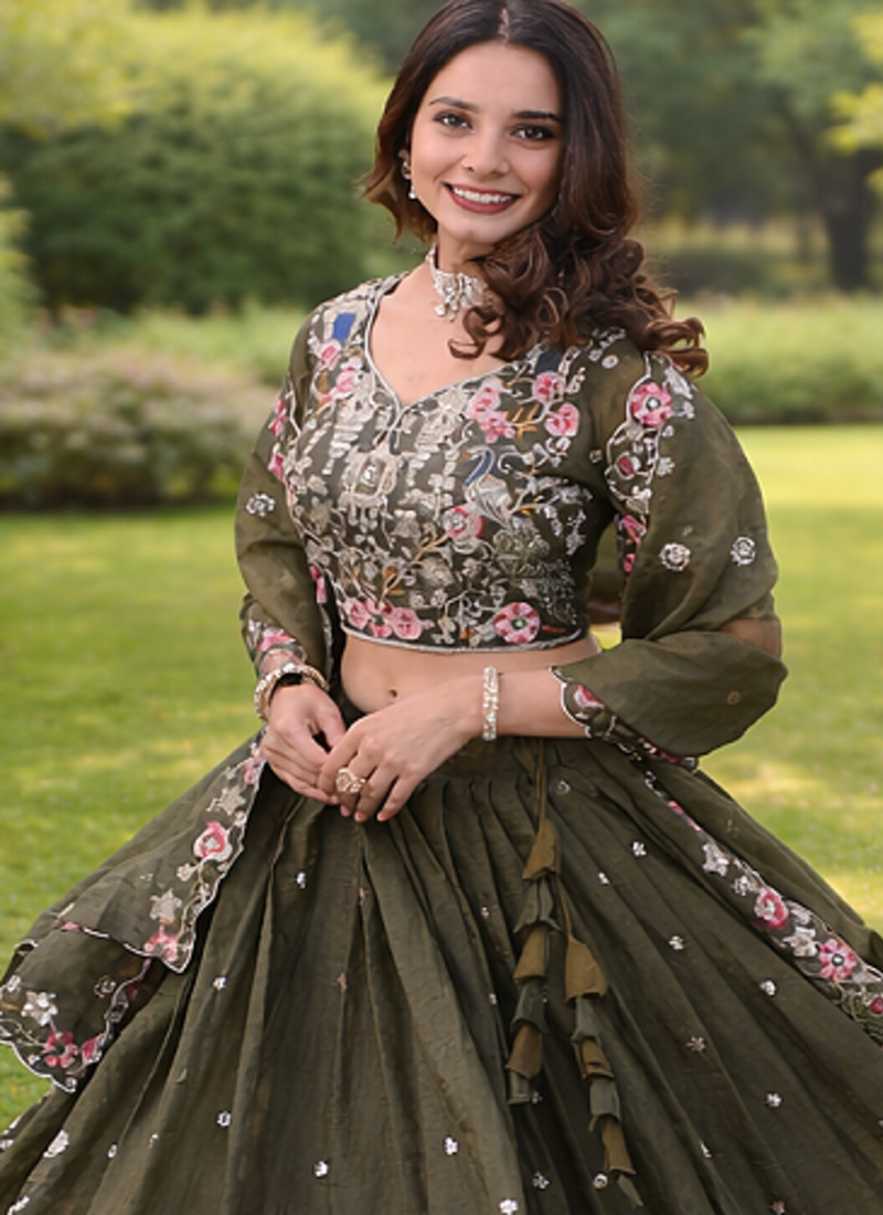| Product Description | Rooted In Nature's Palette Yet Dressed In Celebration, This Gold Crush Lehenga Set In Earthy Olive Is A Quietly Stunning Choice For The Woman Who Stands Out Without Trying. The Organza Blouse Is Hand Crafted With Multi Color Floral Embroidery Blooming Roses, Trailing Vines, And Delicate Petals In Pink, White, And Gold Worked In Fine Zari, Sequins, And Cording Technique That Gives Each Motif Incredible Depth And Texture. The Fully Stitched Lehenga (Waist 42", Length 42") Features A 3 Meter Flair With Canvas Patta Support, Cotton Inner Lining, And A Chain Closure With Dori Latkan For An Authentic Ethnic Finish. The Unstitched Blouse (1 Meter) Allows For A Custom Fit Tailored To Perfection. A Matching Gold Crush Dupatta (2.30 Meters) With Heavy Sequin Zari Embroidery And Designer Lace Border Completes This Three Piece Masterpiece. Perfect For Mehndi Ceremonies, Outdoor Weddings, Festive Brunches, And Eid Gatherings. Ships Internationally Find Your Perfect Ethnic Look Today. |