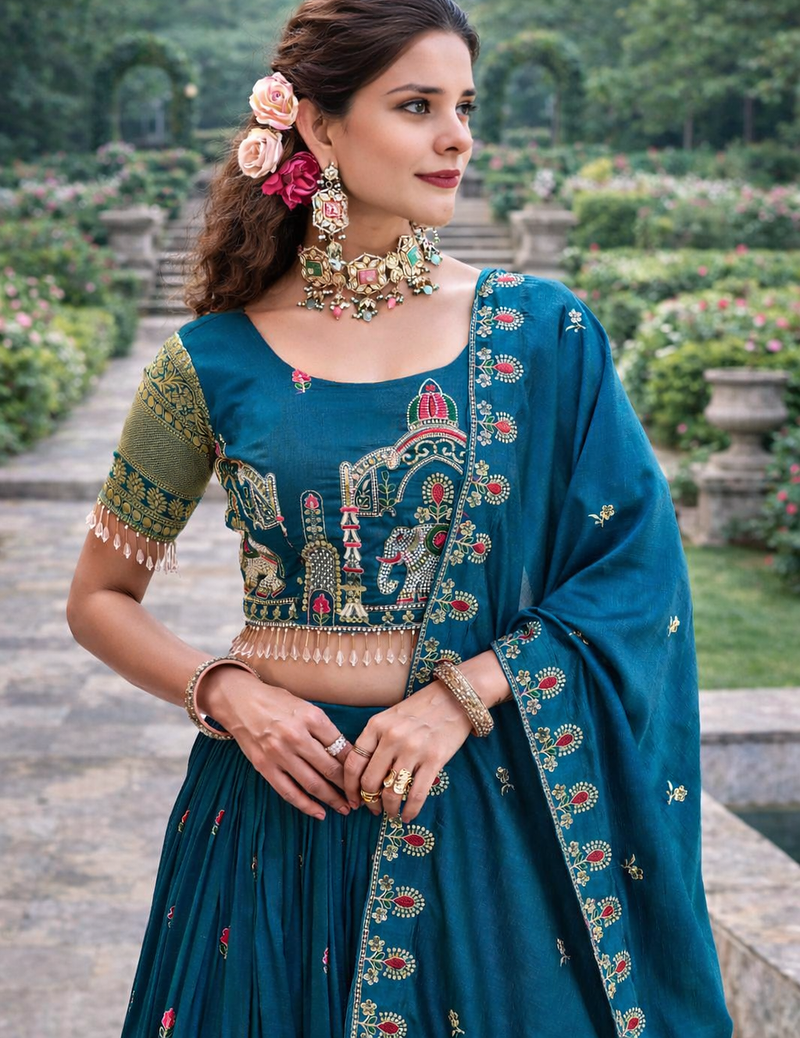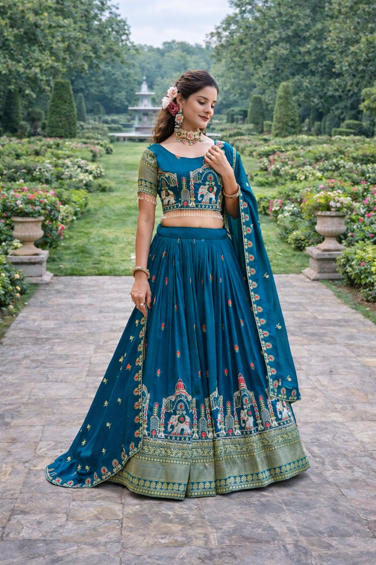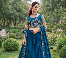 | Product Description | Teal Sequin Embroidered Lehenga Sets Like This Elegant Vichitra Ensemble Are Perfect For Weddings, Festive Celebrations, And Grand Occasions. Crafted From Premium Pure Vichitra Fabric, This Designer Lehenga Set Features Intricate Thread Embroidery And Shimmering Sequin Embellishments That Create A Rich And Sophisticated Ethnic Look. The Beautifully Embroidered Blouse Is Enhanced With Detailed Motifs And Decorative Lace Accents, While The Soft Micro Cotton Inner Ensures Comfort For Long Events. The Matching Lehenga Showcases Heavy Embroidery And Sequin Work With A Graceful 3.5 Meter Flair, Creating A Voluminous Silhouette That Adds Regal Charm To The Outfit. The Coordinating Vichitra Dupatta Is Adorned With Delicate Embroidery And Sequin Detailing, Completing The Ensemble With Elegance And Flow. Ideal For Weddings, Receptions, Festive Gatherings, And Cultural Celebrations, This Embroidered Teal Lehenga Set Blends Traditional Craftsmanship With Modern Elegance. Style It With Statement Jewelry And Heels To Create A Stunning Celebration Ready Look. |