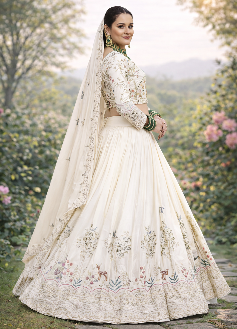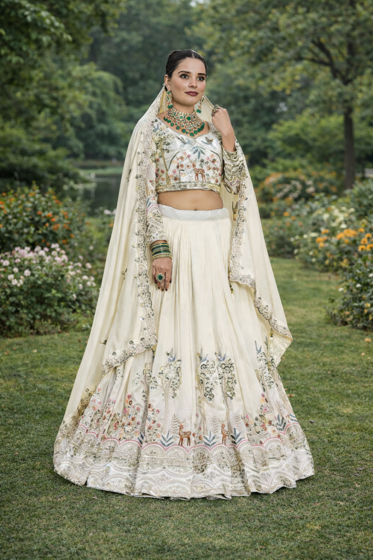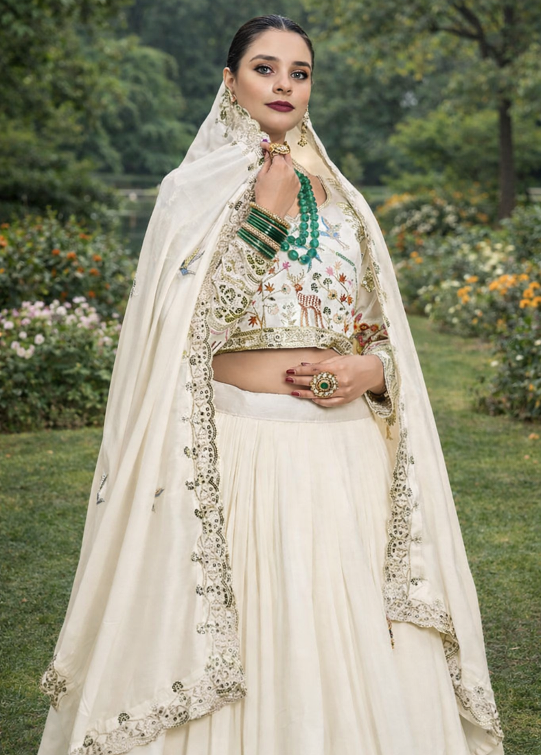| Product Description | White Sequin Embroidered Lehenga Sets Like This Elegant Vichitra Ensemble Bring Timeless Charm And Refined Sophistication To Festive Celebrations. Crafted From Premium Pure Vichitra Fabric, This Designer Lehenga Set Features Intricate Thread Embroidery And Shimmering Sequin Work That Beautifully Enhances The Soft White Tone. The Embroidered Blouse Showcases Delicate Artistic Motifs And Fine Detailing, While The Micro Cotton Inner Lining Ensures Comfort And Breathability For Long Hours Of Wear. The Matching Lehenga Is Designed With Heavy Embroidery And Sequin Embellishments, Creating A Luxurious 3.5 Meter Flair That Offers A Graceful And Voluminous Silhouette. Completing The Ensemble Is A Coordinated Vichitra Dupatta Adorned With Elegant Embroidery And Sequin Accents, Adding A Flowing And Sophisticated Finishing Touch. Perfect For Weddings, Receptions, Festive Celebrations, And Cultural Occasions, This Embroidered White Lehenga Set Combines Traditional Craftsmanship With Modern Elegance. Pair It With Statement Jewelry And Classic Heels To Create A Graceful And Unforgettable Ethnic Look. |