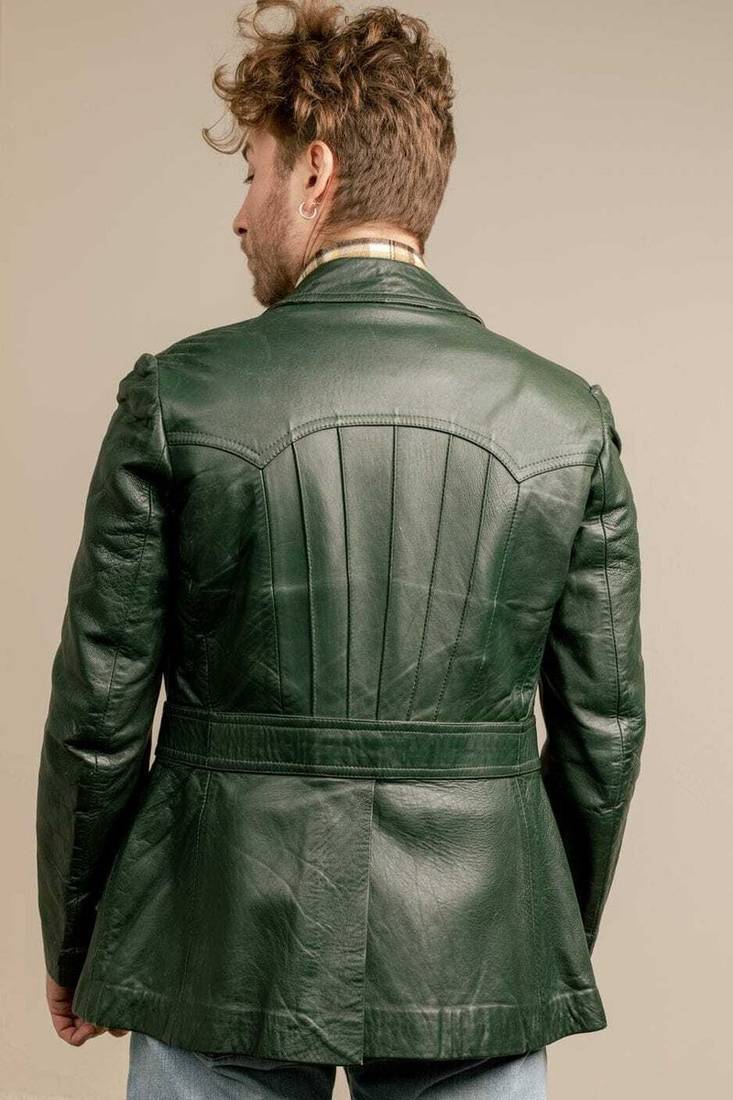 Mens olive green lambskin leather jacket button partern long collar style back belt