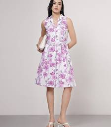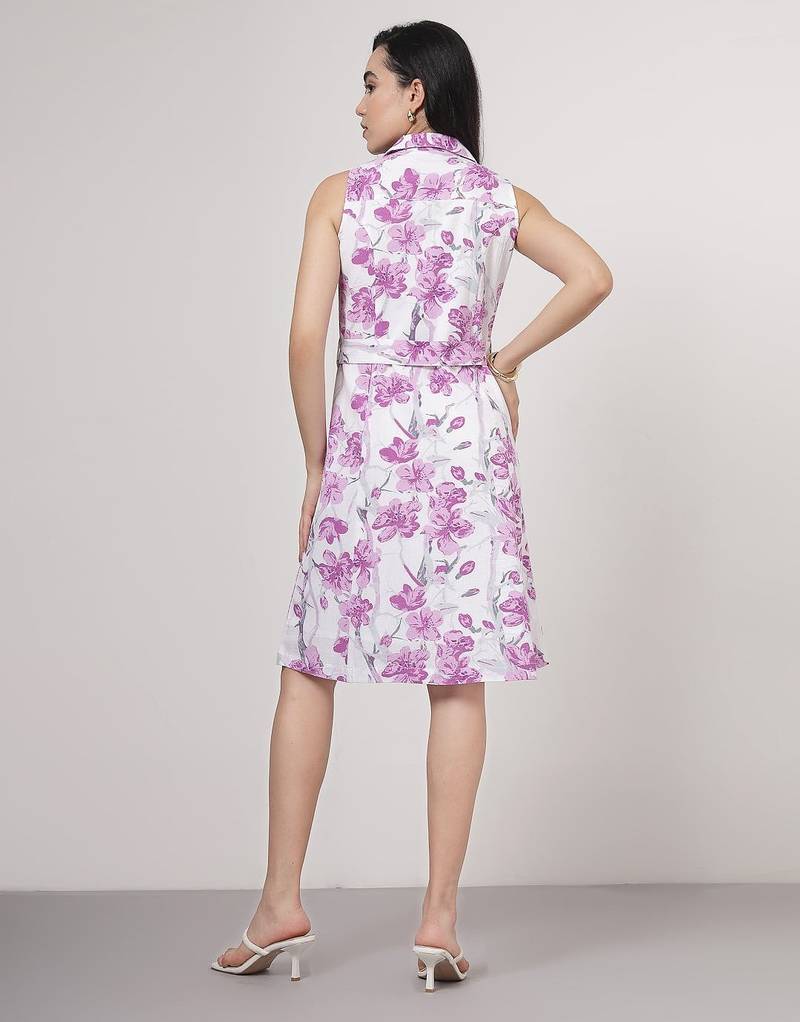 | Product Description | A Line Sleeveless Knee Length Dress With Lavender Floral Print, Collar Neck, Front Buttons, Detachable Waist Belt; Fully Lined |