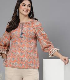 | Product Name | Apricot Crush Floral Print Puff Sleeve Cotton Top With Lace Inserts, Tie Up Neck & Side Slits | |