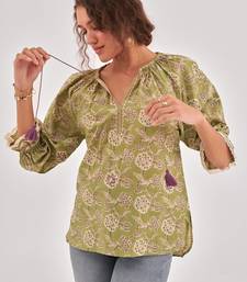 | Product Name | Fern Green Floral Print Puff Sleeve Cotton Top With Lace Inserts, Tie Up Neck & Side Slits | |