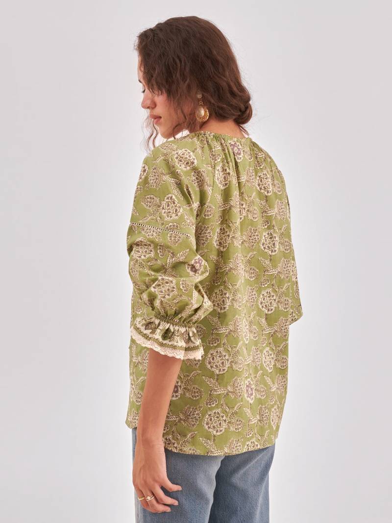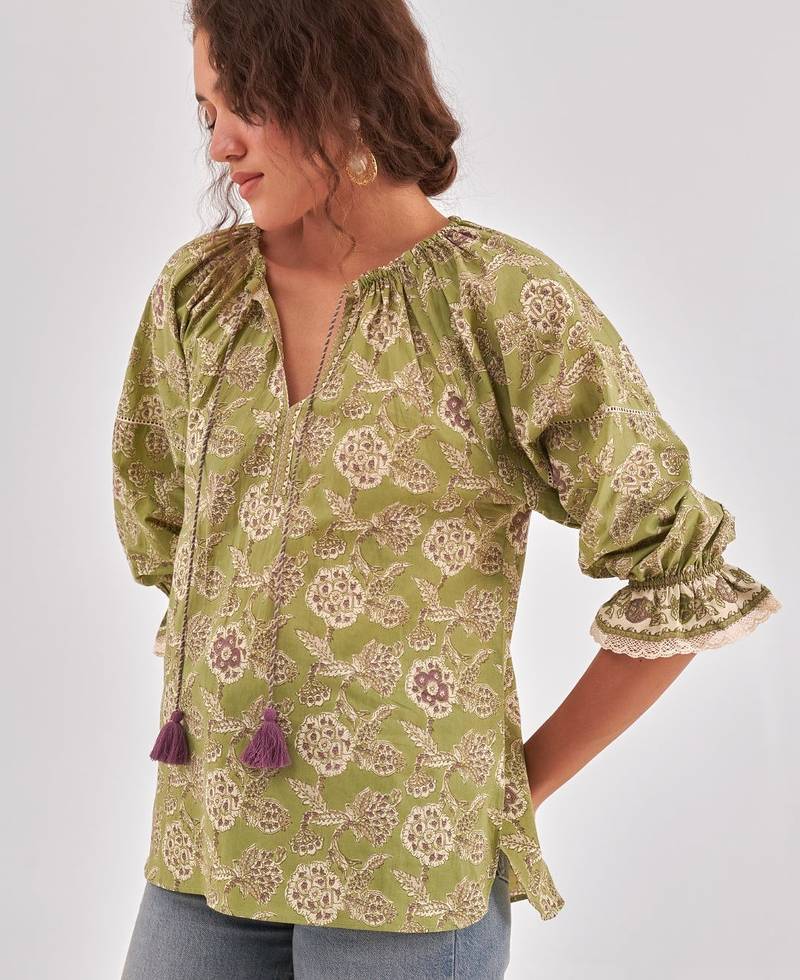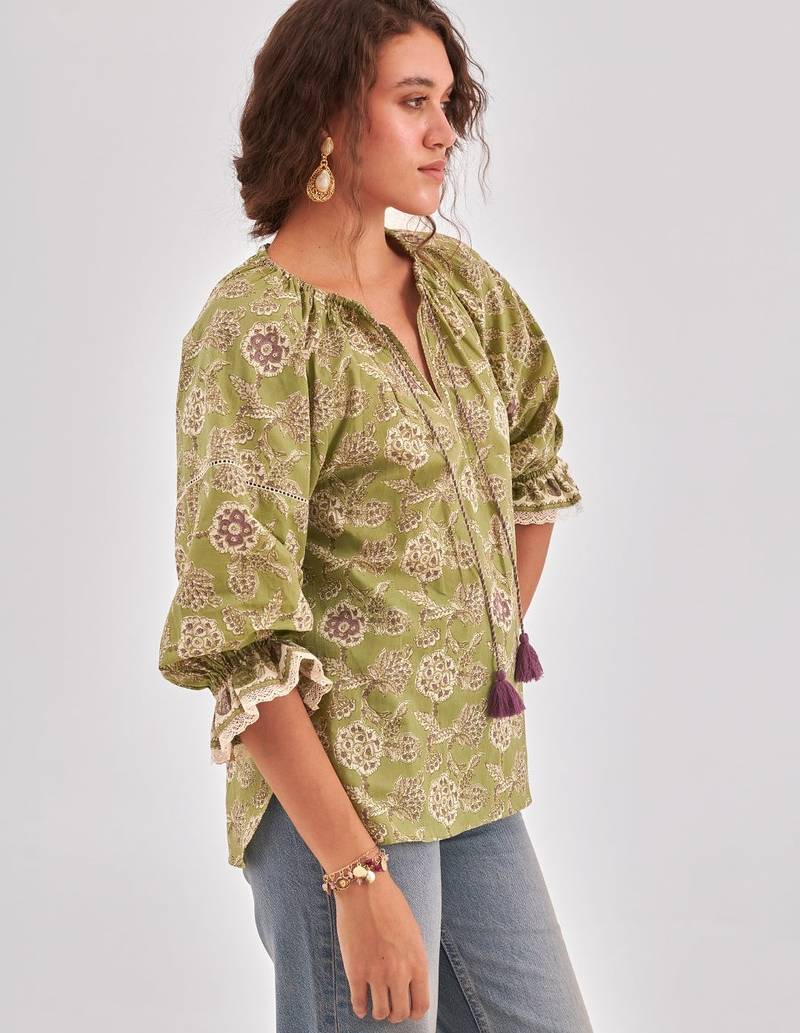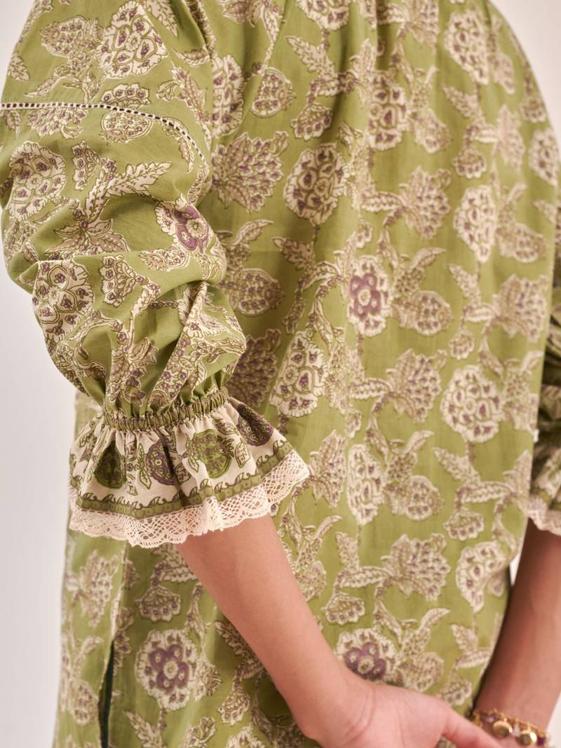 Fern green floral print puff sleeve cotton top with lace inserts, tie up neck & side slits