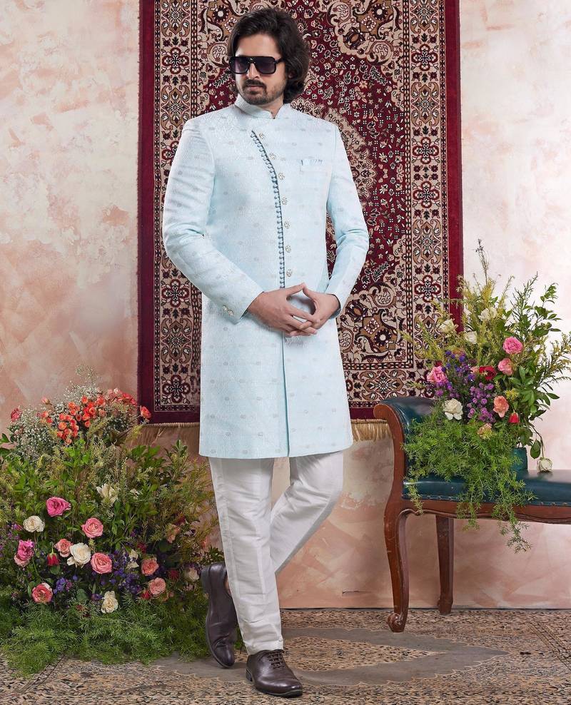 Blue banarasi jacquard indo western for men