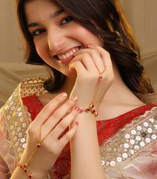| Product Description | This Gold Plated Kundan Haath Phool Is Embellished With Radiant Red Stones, Creating A Striking And Royal Effect. Designed With Intricate Detailing, It Connects Ring And Bracelet Elegantly. Perfect For Brides And Festive Occasions, It Enhances Hand Movements With Grace And Traditional Beauty.